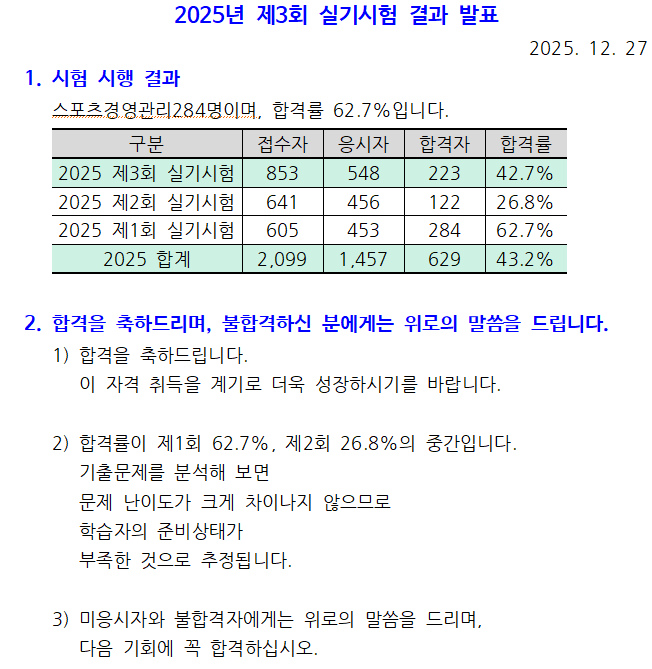 2025년 제3회 실기시험 결과 발표 작성자운영자|작성시간25.12.27|조회수296 목록 댓글 0 글자크기 작게가 글자크기 크게가 다음검색 현재 게시글 추가 기능 열기 북마크 공유하기 신고 센터로 신고 댓글 댓글 0 댓글쓰기 답글쓰기 댓글 리스트