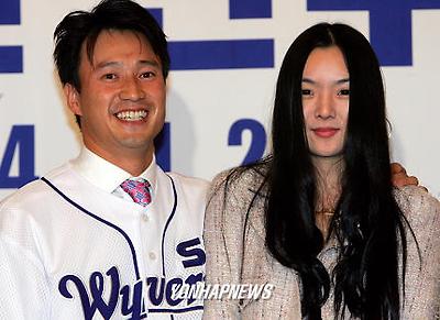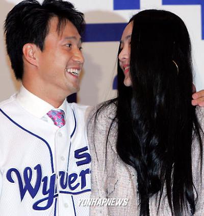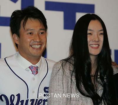 SK와이번스 입단식에서 다음달 16일 결혼할 약혼녀 김진희씨와 다정한 표정을 짓고 있다.