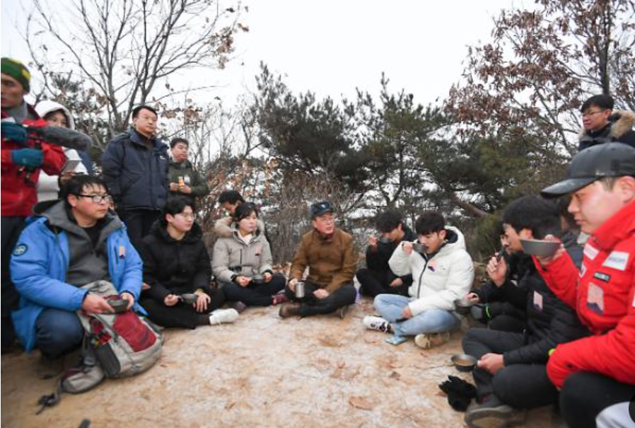 문재인 대통령이 2020년 아차산에서 새해 해맞이 산행 중 담소하고 있다. 문재인대통령은 등신마니아다 . 히말라야 라다크 , 에베레스트 , 안나푸르나 , 랑탕 트레킹 5,900m 고지까지 오른 프로급이다 . 히말라야등반시 노무현 대통령 탄핵소식을 듣고 급거 귀국 대응에 나섰다 . 그는 산행을 이렇게 묘사한 적이 있다 . 산을 생각하면 가슴이 뛴다 --- 멀리 떨어져서 깊이 생각하는 성찰의 시간이다. 산행은 그의 삶의 방식이자 소통방식이다. 대통령재임 중 아차산에서 해맞이 등산을 했고, 백두산천지를 김정은 국무위원장과 함께 등정했다 .