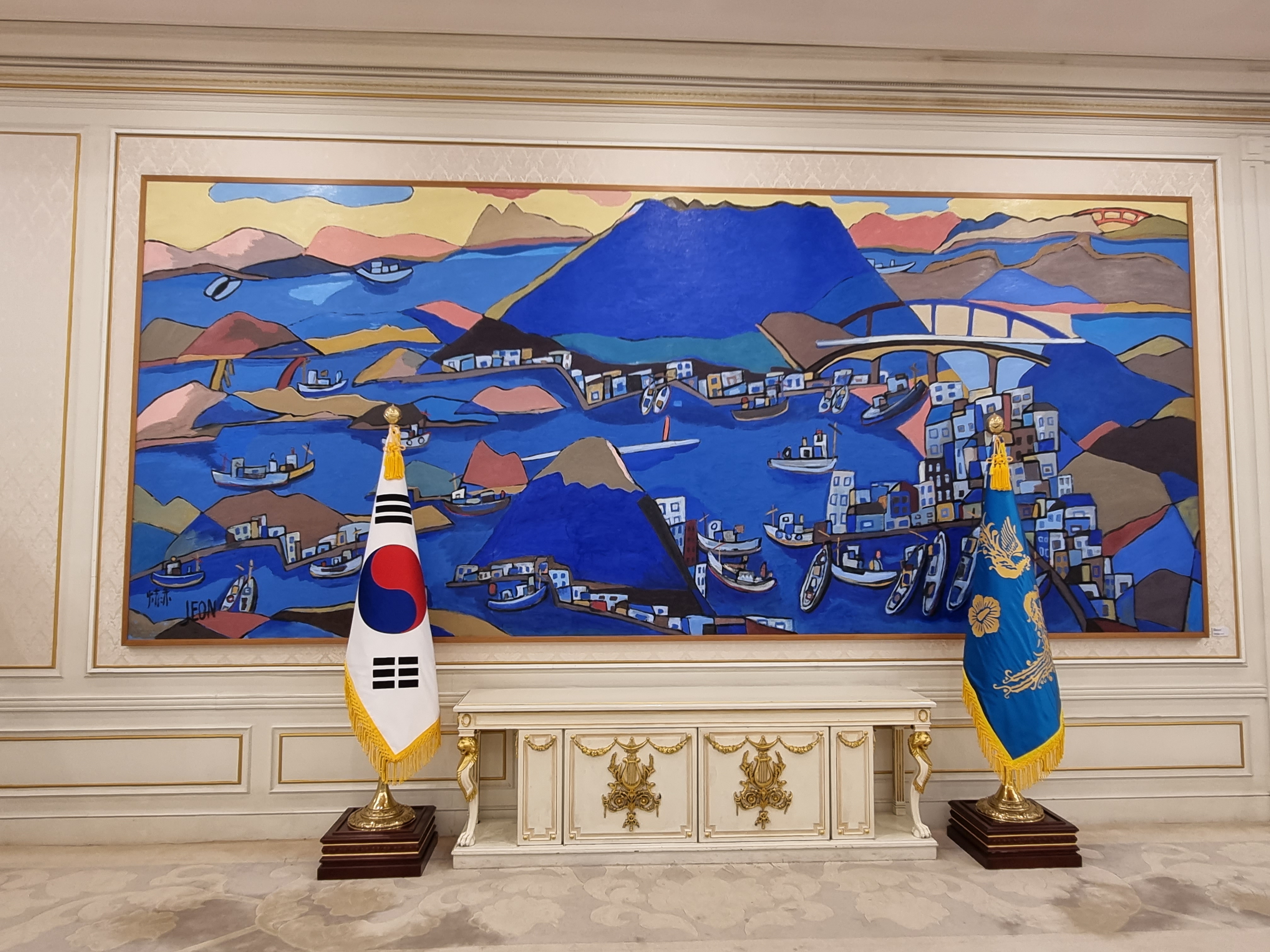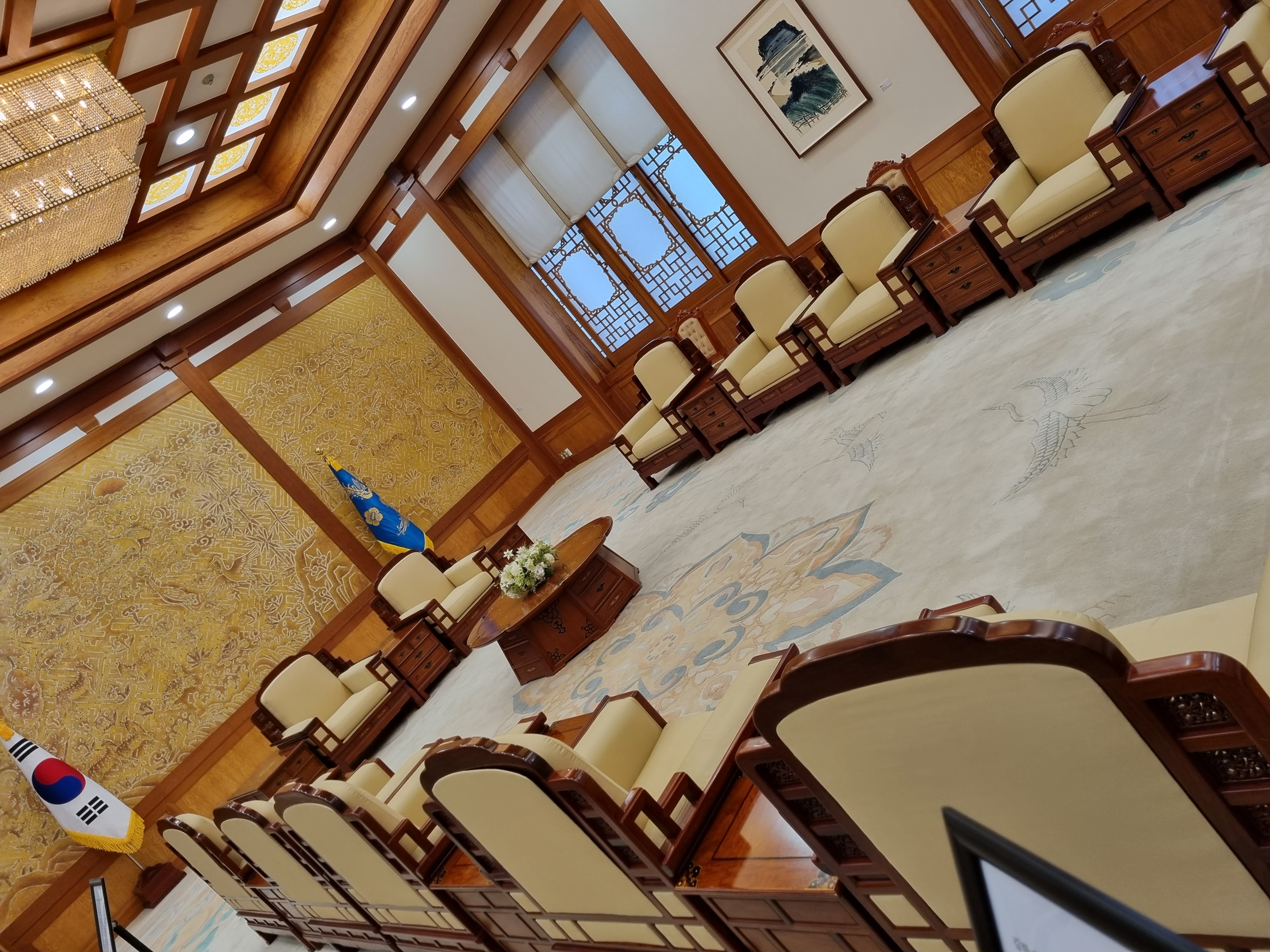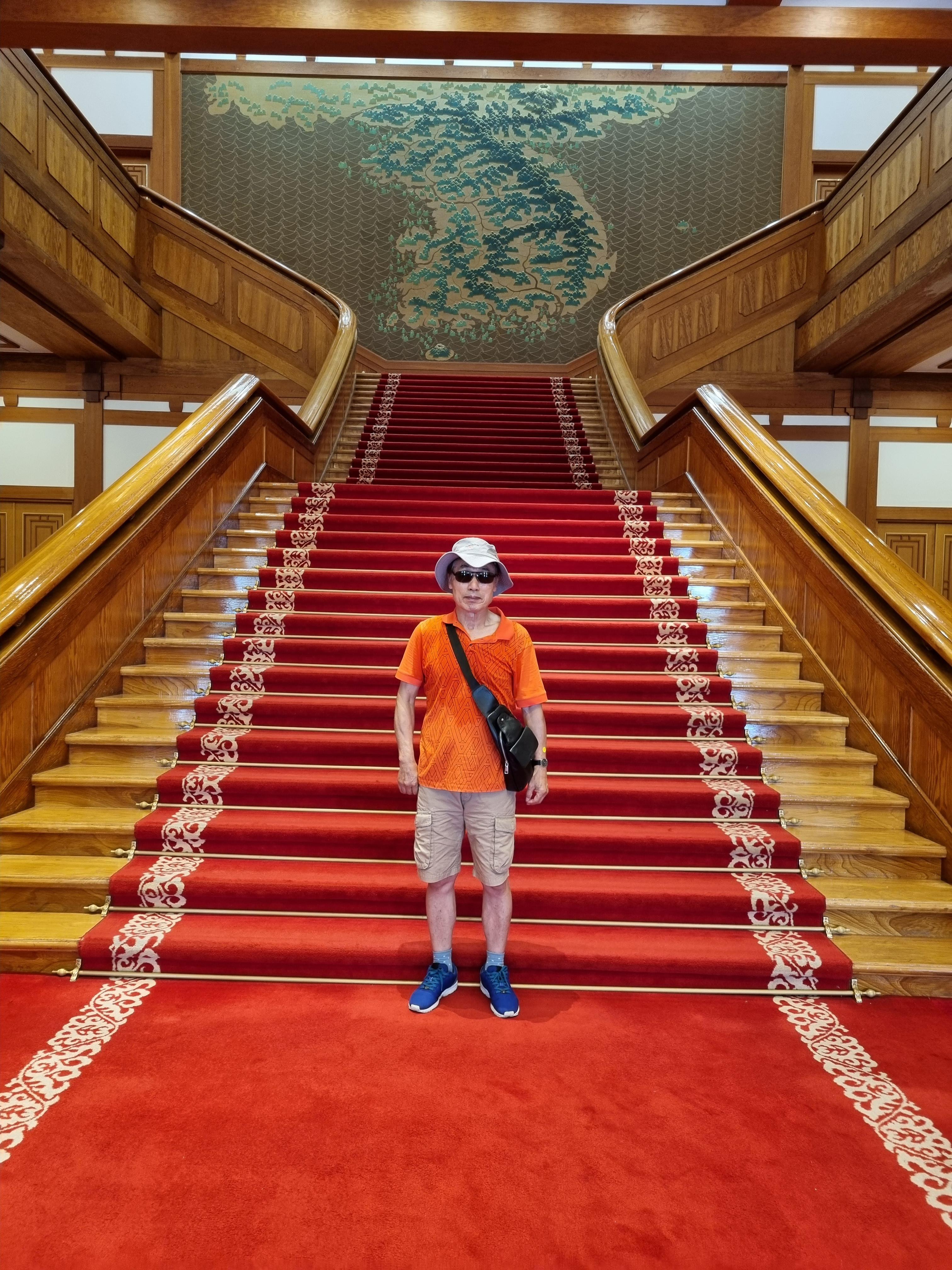 영부인접견실을 훑고, 좌측의 충무실에서 서예가 천태인 이수덕 여사의 전서작품 '추애일일신지대한민국' 10폭 병풍 앞에서 한참동안 서성댔다. 여류작품이란 생각이 안들 정도로 글씨가 힘차고 생동한다 할까. 2층대통령집무실 계단에 김식의 ‘금수강산도’가 압권이다. 백두대간의 힘찬 기세가 한반도를 형성하고 있다.