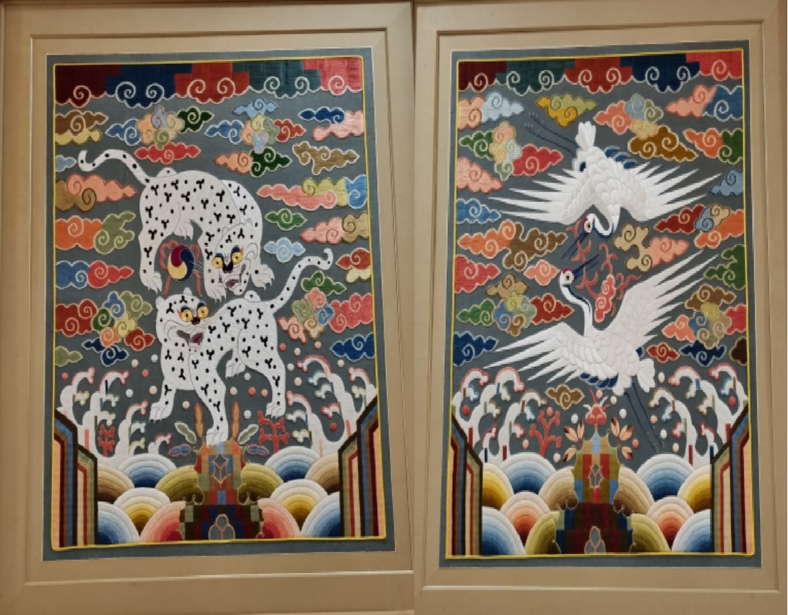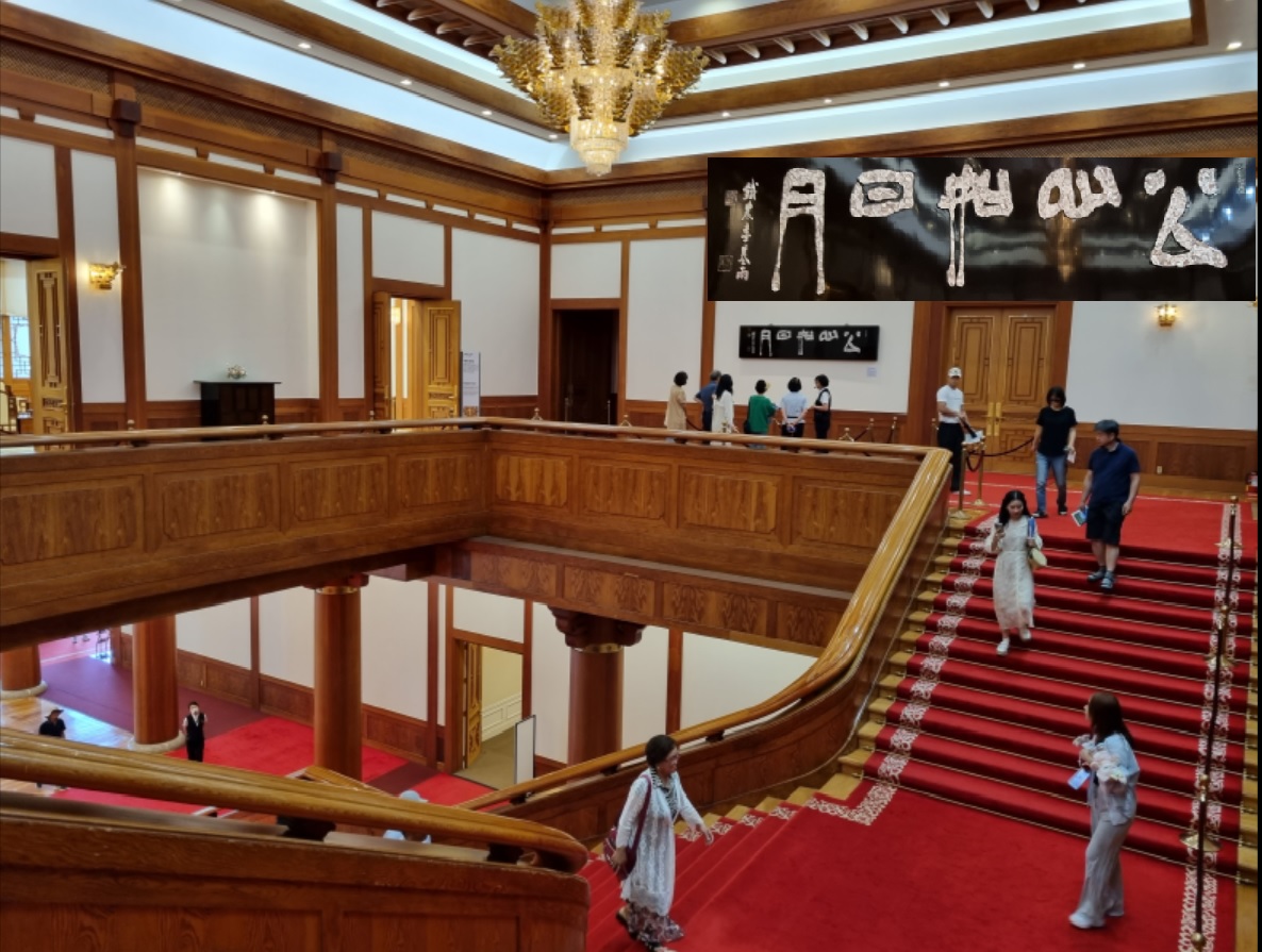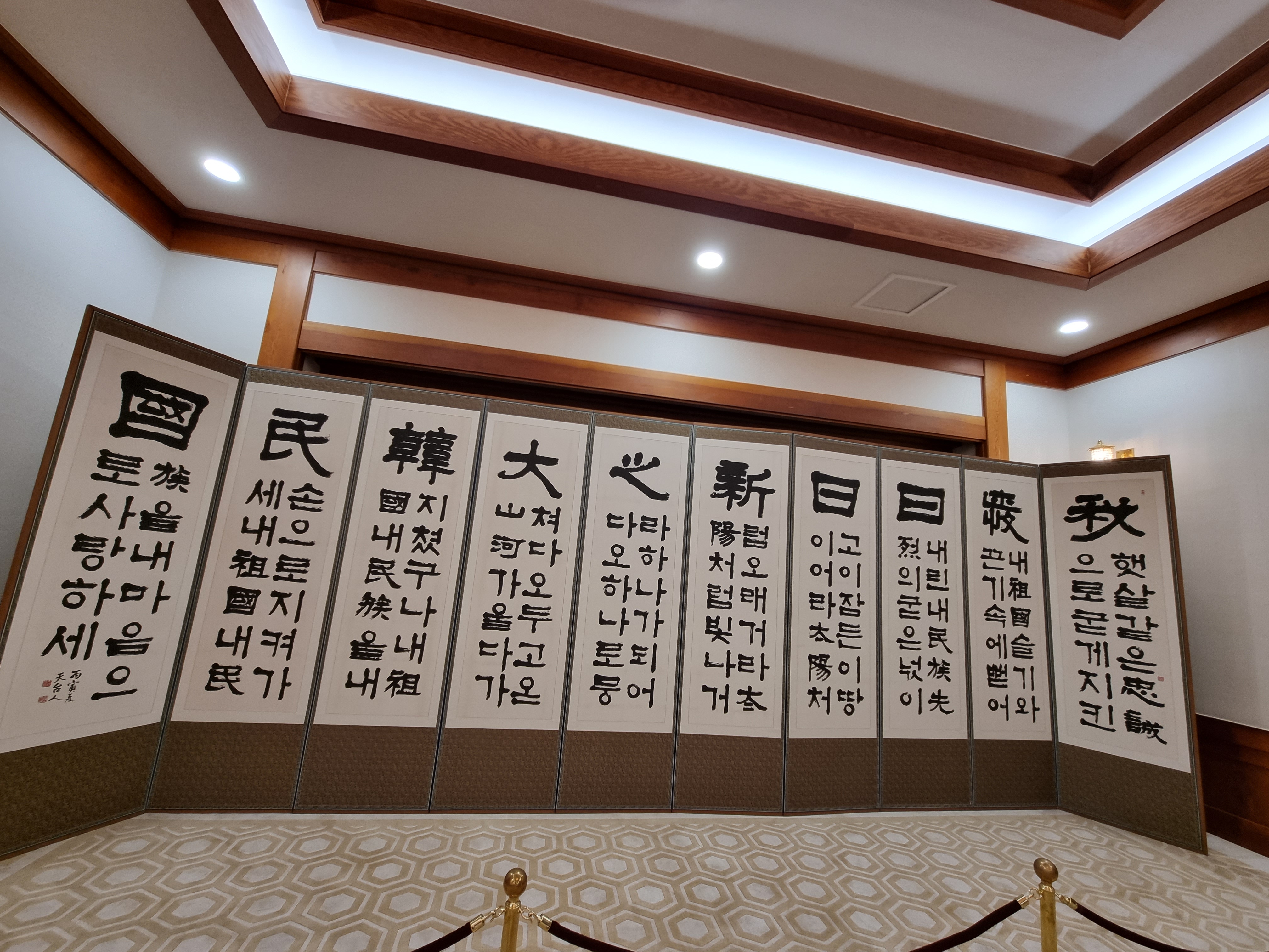 충무실 전실에서 그룹 '방탄소년단(BTS)'을 맞이했던 10폭 병풍, 서예가 천태인 이수덕 여사의 전서작품 '추애일일신지대한민국'
