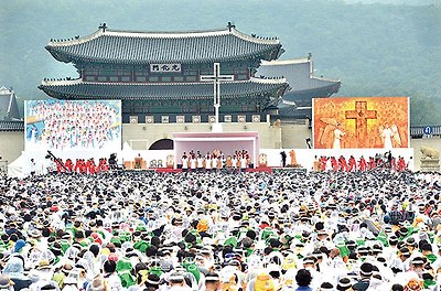 | | ▲ 2014년 8월 16일 광화문광장에서 프란치스코 교황이 윤지충 바오로와 동료 123위 시복식을 거행하고 있다. 가톨릭평화신문 DB |