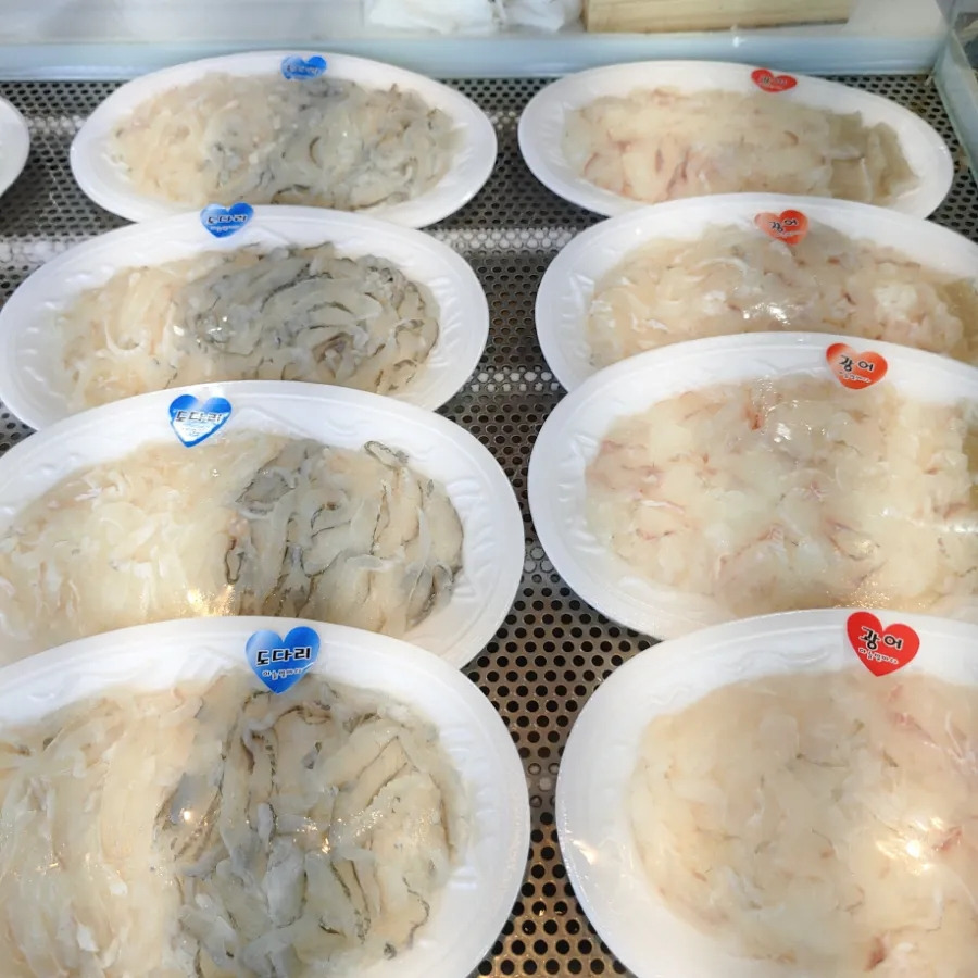 백골뱅이, 오징어회, 가자미회, 광어, 도다리, 멍게를 위생적으로 포장해 놓아 입맛과 취향에 맛게 골라 푸짐하게 장을 봤어요.