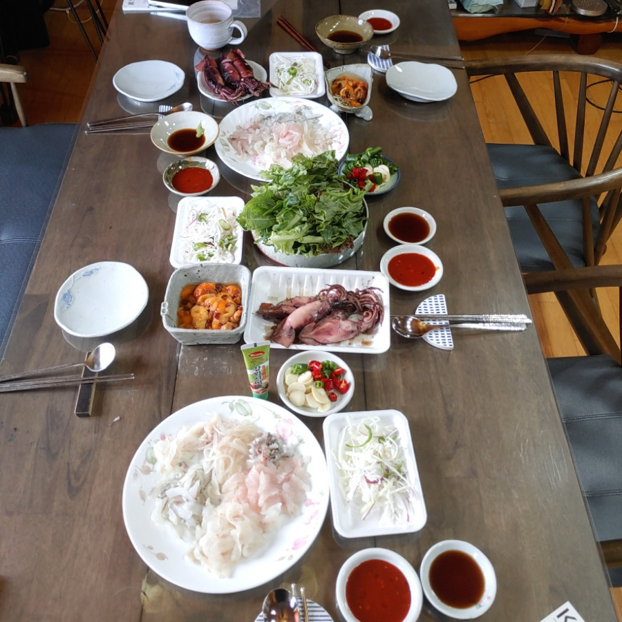 기묘한 여름 바다향을 품은 멍게와 광어, 우럭, 가자미, 오징어회와 오징어통찜, 각종 야채, 메밀전.....