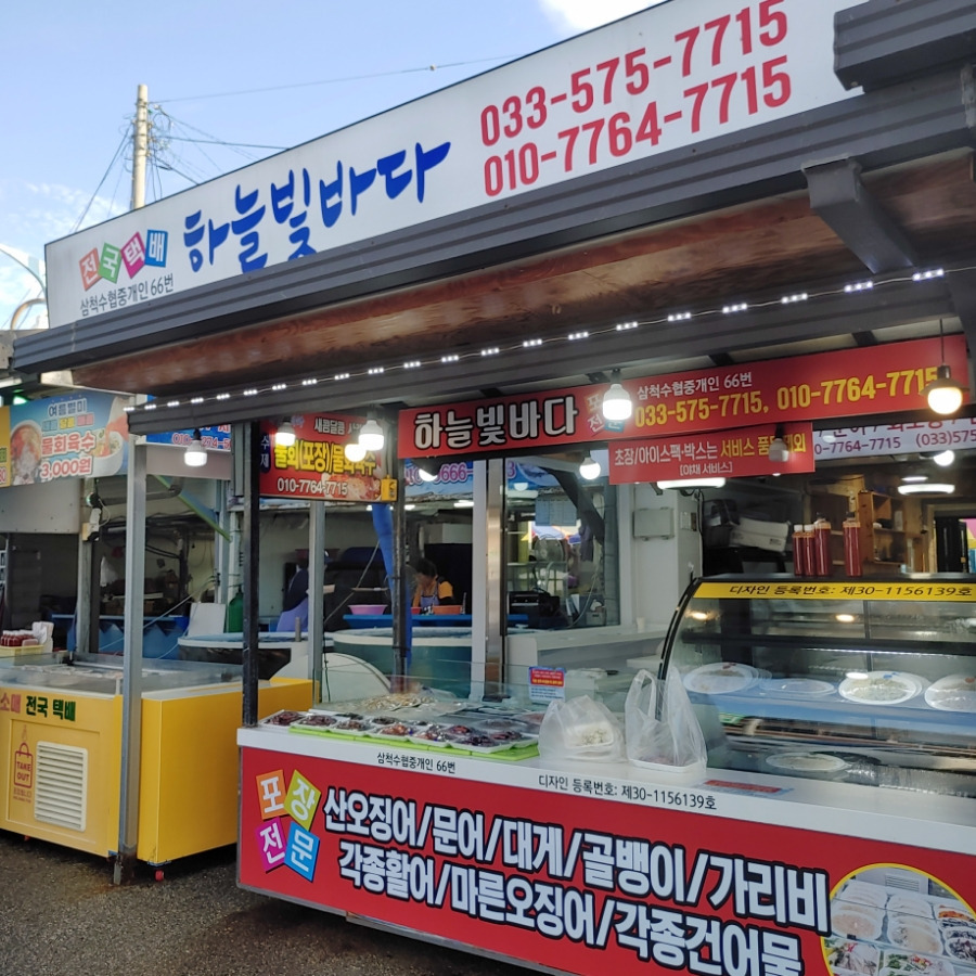 큰 길가에 위치해 각종 해산물을 포장해서 판매하고 있는 하늘빛바다는 깨긋한 손질과 친절함으로 인기가 가장 많아요.
