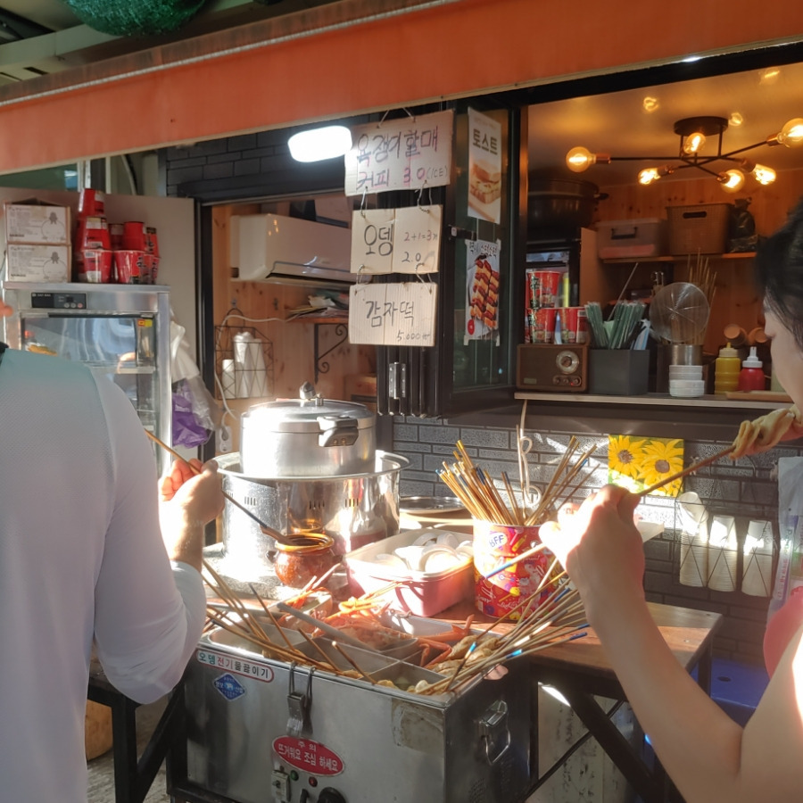 번개시장 맛집 토스트집도 보이고 꽃게 한 마리 풍덩한 오뎅꼬치도 보이네요.