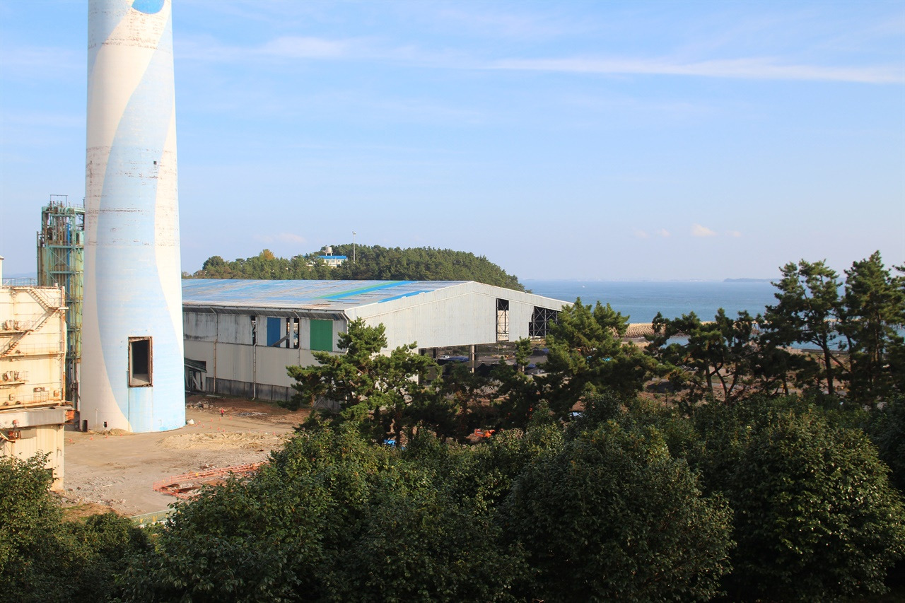 | ▲ 천연기념물로 지정된 마량리 동백나무숲 앞에 철거 중인 구) 서천화력 모습 |