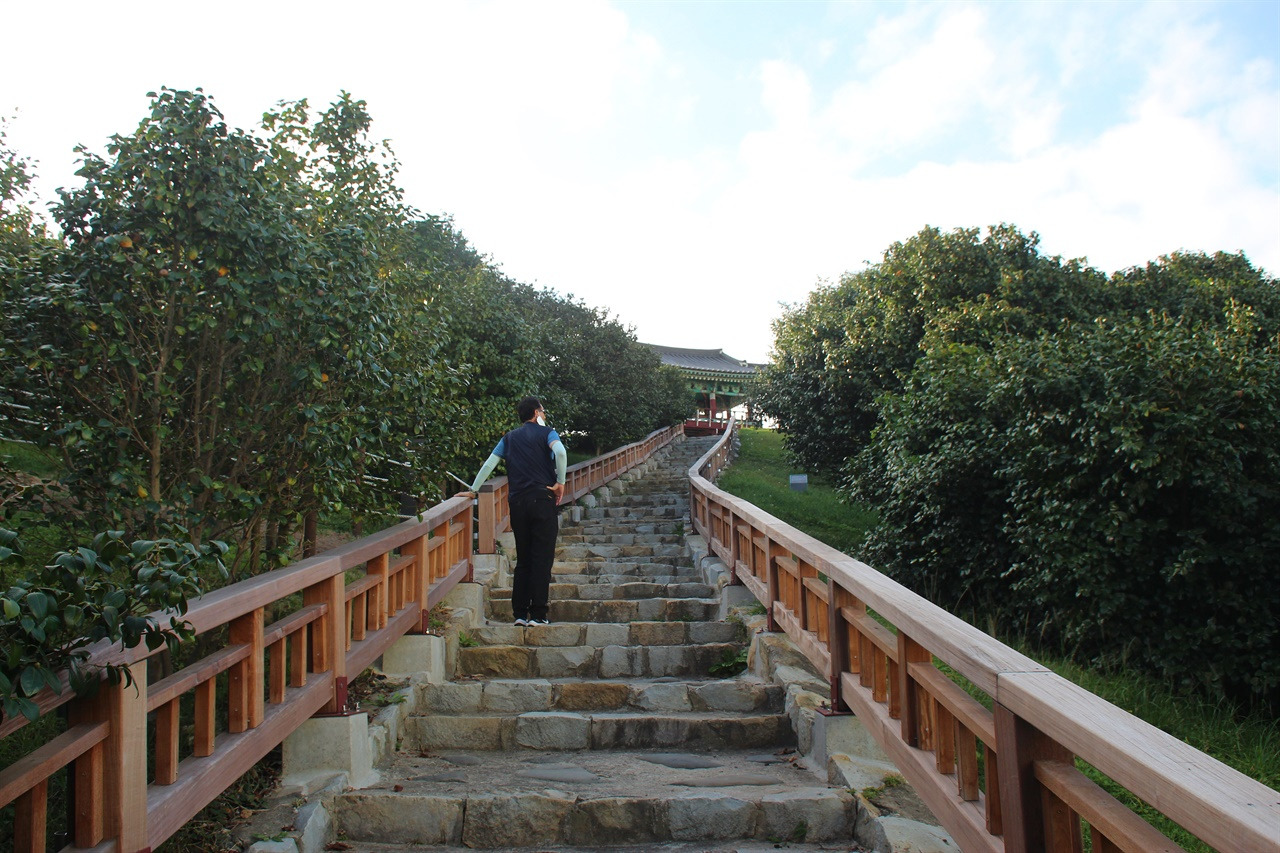 동백나무숲 중간 지점에 올라가는 입구가 보인다. 입구는 조금 좁은 돌계단이다. 별로 높지 않아 동백나무를 보며 천천히 오르기 좋다. 10분이면 충분하다. 동백꽃은 이른 봄 3월 하순경이면 빨갛게 꽃이 피는데 매우 아름답다. 5월이 되면 꽃잎이 떨어지고, 떨어진 꽃잎마저도 시들지 않고 한참 동안 머물며 아름다움을 재발산하는 매력적인 꽃이다.