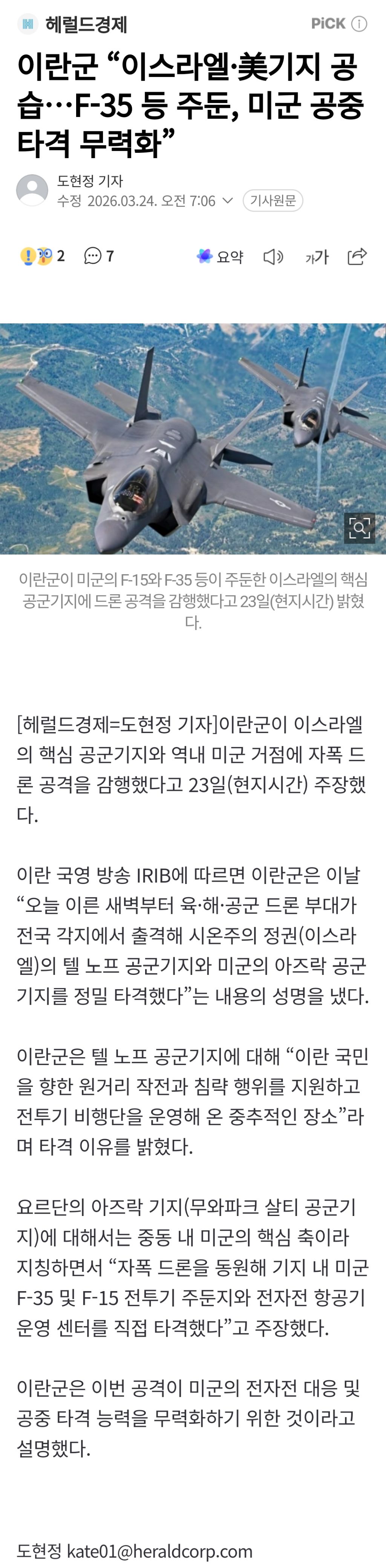 이란군 "이스라엘•美기지 공습...F-35 등 주둔, 미군 공중 타격 무력화" 작성자아침해3|작성시간26.03.24|조회수717 목록 댓글 4 글자크기 작게가 글자크기 크게가 https://naver.me/FM9hxZdN 다음검색 현재 게시글 추가 기능 열기 북마크 공유하기 신고 센터로 신고 댓글 댓글 4 댓글쓰기 답글쓰기 댓글 리스트 작성자구름고래 | 작성시간 26.03.24 뭐가 맞는건지....... 작성자35년간 사정준비 | 작성시간 26.03.24 전세계가 구라치는중 작성자어허라조지구나 | 작성시간 26.03.24 다 구라인듯. 저걸 미국이 쳐맞고 지금까지 조용할리가요.. 작성자아마도그건 | 작성시간 26.03.24 더 열심히 해라 댓글 전체보기