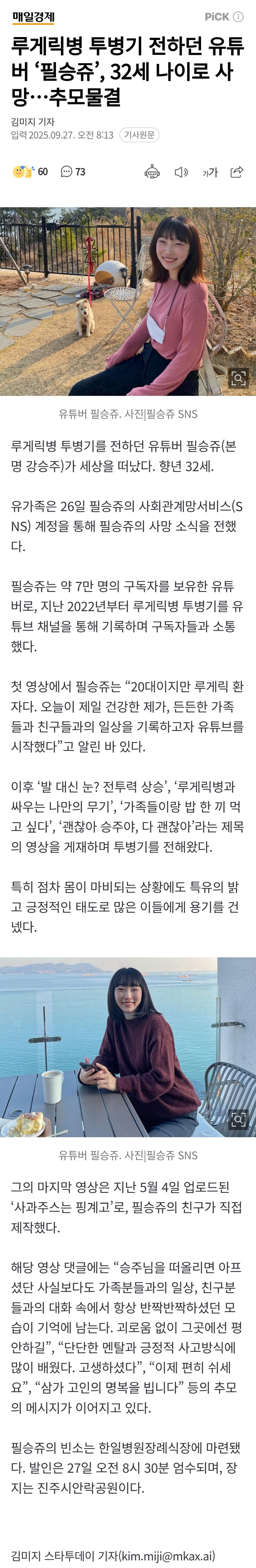 루게릭병 투병기 전하던 유튜버 필승쥬, 32세 나이로 사망 작성자아침해3|작성시간25.09.27|조회수14,918 목록 댓글 49 글자크기 작게가 글자크기 크게가 https://naver.me/xt4kFVbq고인의 명복을 빕니다 다음검색 현재 게시글 추가 기능 열기 북마크 공유하기 신고 센터로 신고 댓글 댓글 49 댓글쓰기 답글쓰기 댓글 리스트 작성자황초롱이 | 작성시간 25.09.27 삼가 고인의 명복을 빕니다 작성자SuperCord | 작성시간 25.09.27 고인의명복을빕니다 작성자낭만존슨™ | 작성시간 25.09.27 서서히 몸이 마비되어가고 대게는 30 전후로 세상을 떠나는평온히 안식하시길 작성자유별란친구 | 작성시간 25.09.27 누구인지 모르나 부고 소식 접했으니 삼가 고인의 명복을 빕니다.젊은 나이에 이른 별이 되셨네요.영면 하시길.. 작성자디세이블 | 작성시간 25.09.28 삼가 고인의 명복을 빕니다. 댓글 전체보기