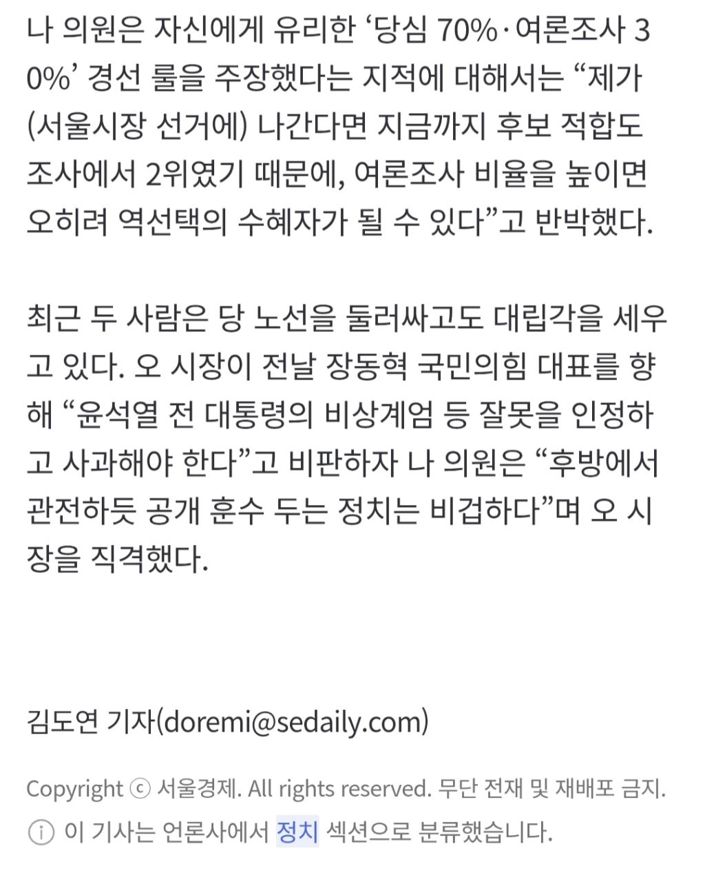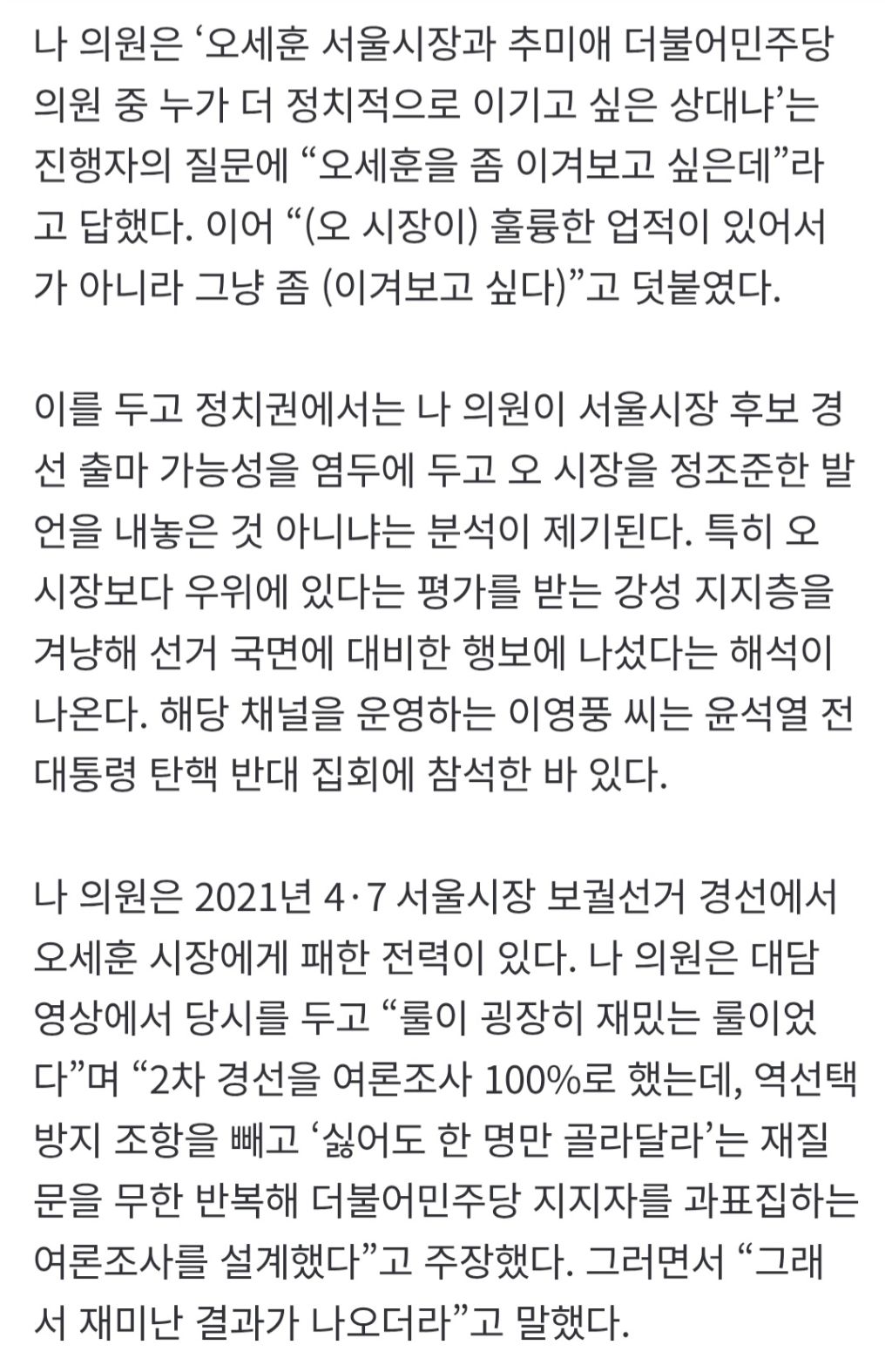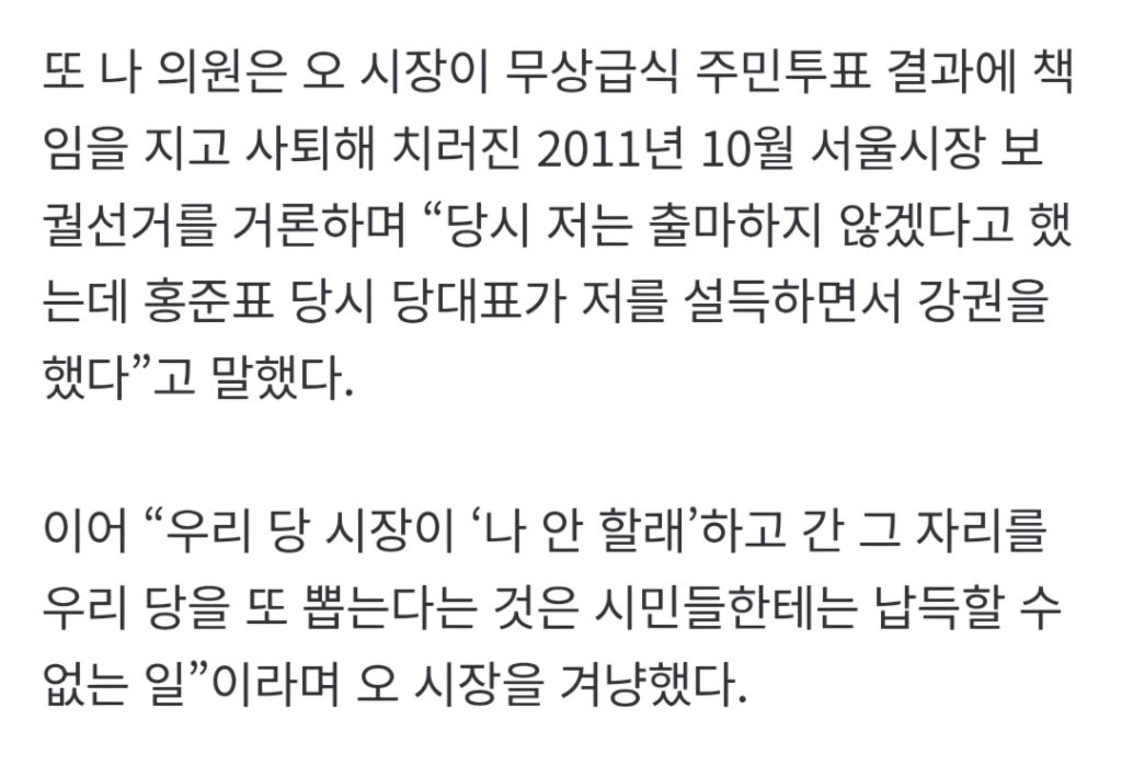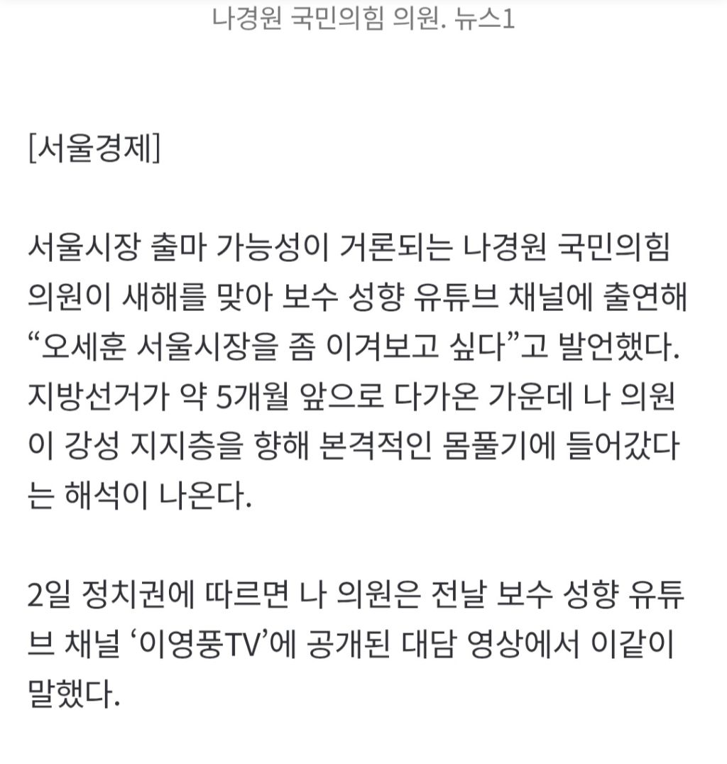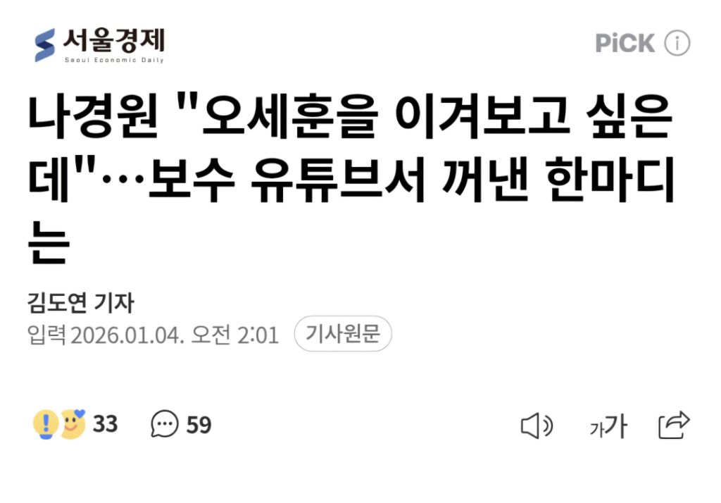 나경원 "오세훈을 이겨보고 싶은데"…보수 유튜브서 꺼낸 한마디는 작성자kama|작성시간26.01.04|조회수1,277 목록 댓글 2 글자크기 작게가 글자크기 크게가 출처: https://naver.me/5norP232나경원 "오세훈을 이겨보고 싶은데"…보수 유튜브서 꺼낸 한마디는서울시장 출마 가능성이 거론되는 나경원 국민의힘 의원이 새해를 맞아 보수 성향 유튜브 채널에 출연해 “오세훈 서울시장을 좀 이겨보고 싶다”고 발언했다. 지방선거가 약 5개월 앞으로 다n.news.naver.comㅋㅋㅋ 다음검색 현재 게시글 추가 기능 열기 북마크 공유하기 신고 센터로 신고 댓글 댓글 2 댓글쓰기 답글쓰기 댓글 리스트 작성자닌제발좀 | 작성시간 26.01.04 명태한테 부탁해봐 작성자플러스알파 | 작성시간 26.01.04 나경원 화이팅!! ㅋㅋㅋㅋㅋㅋㅋㅋ 댓글 전체보기