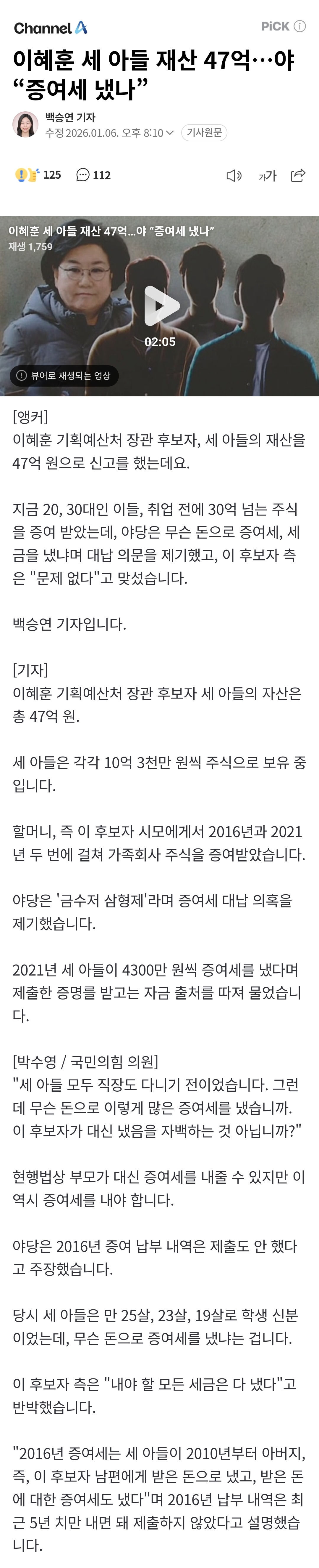 이혜훈 세 아들 재산 47억…야 “증여세 냈나” 작성자fate2222|작성시간26.01.07|조회수2,174 목록 댓글 20 글자크기 작게가 글자크기 크게가 다음검색 현재 게시글 추가 기능 열기 북마크 공유하기 신고 센터로 신고 댓글 댓글 20 댓글쓰기 답글쓰기 댓글 리스트 작성자풍류비머 | 작성시간 26.01.07 재밌어 ㅋㅋ 작성자연느킴 | 작성시간 26.01.07 아마 국힘에 이런 사람들 태반이지.. 작성자오빠 그구멍이 아니자나 | 작성시간 26.01.07 ㅋㅋㅋ 어디서 이런 똥을 데리고 왔어 작성자Larz | 작성시간 26.01.07 이거 주진우가 함 파봐라 재밌겄다 작성자라면은왜농심인가 | 작성시간 26.01.07 겁나 재밌네 진짜 ㅋㅋㅋㅋㅋㅋㅋㅋㅋㅋㅋㅋ 댓글 전체보기