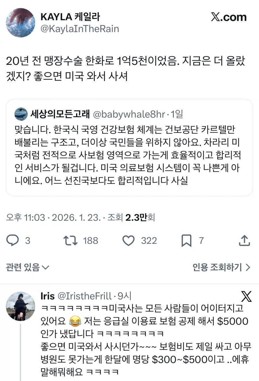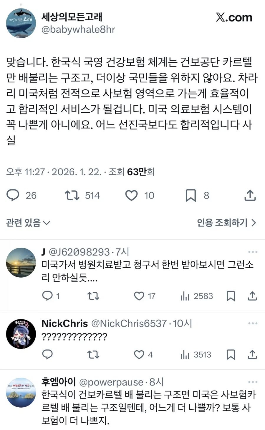작성시간 26.01.25 저능아는 건보료 내지 말고 아프면 미국가서 치료 받아라 선진국 의료 시스템이니