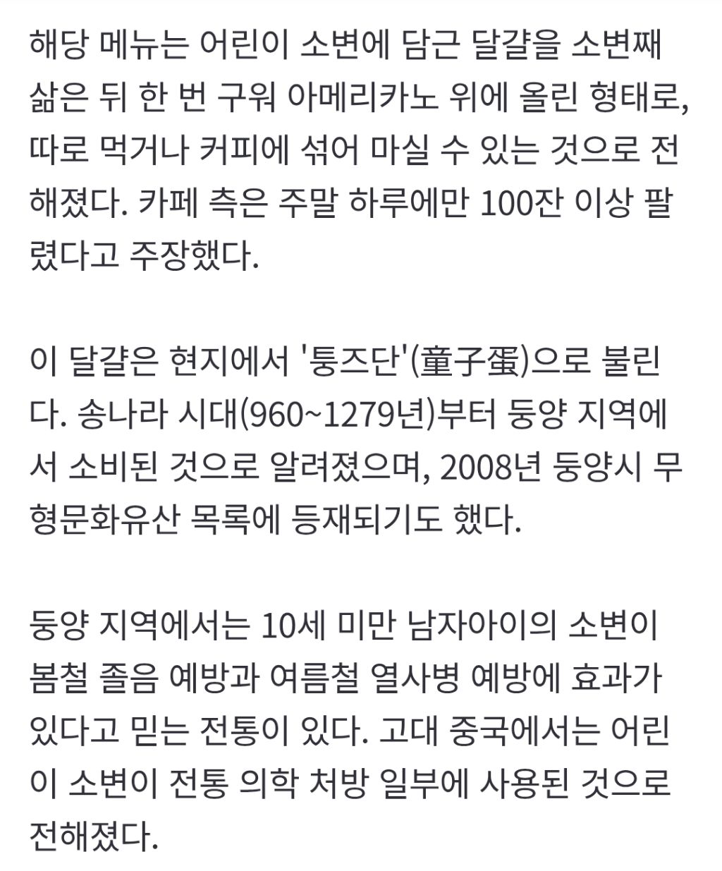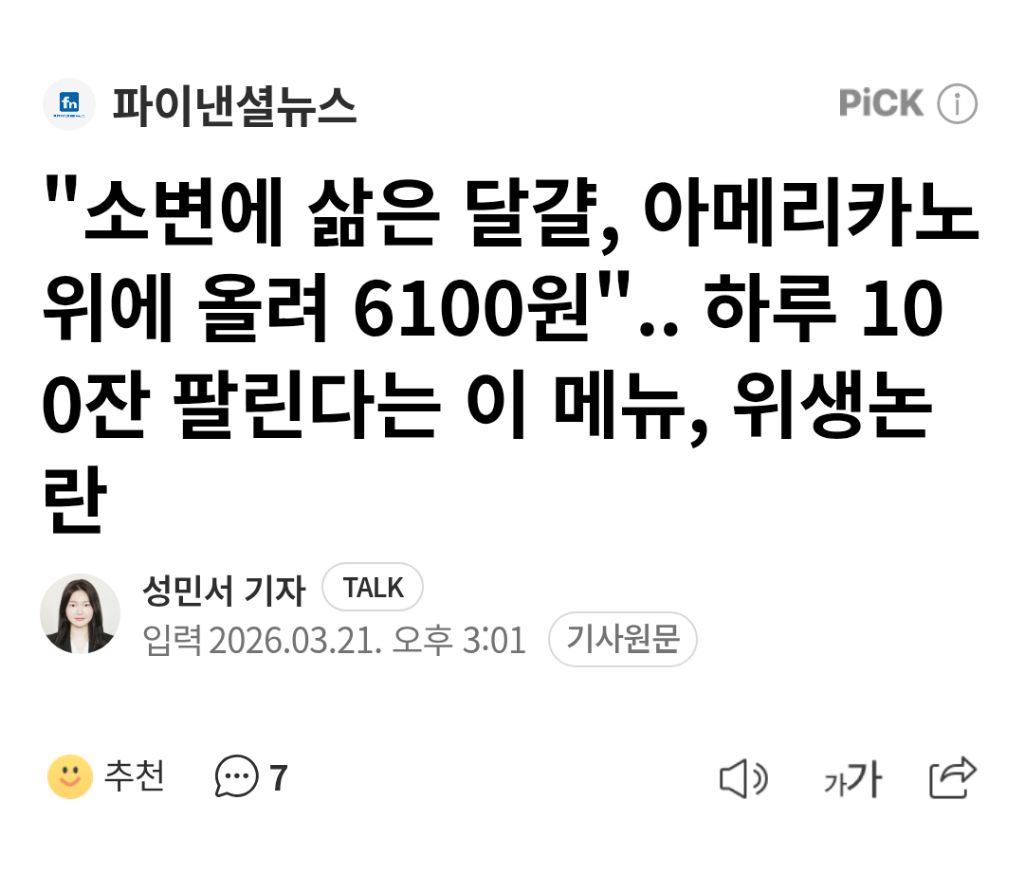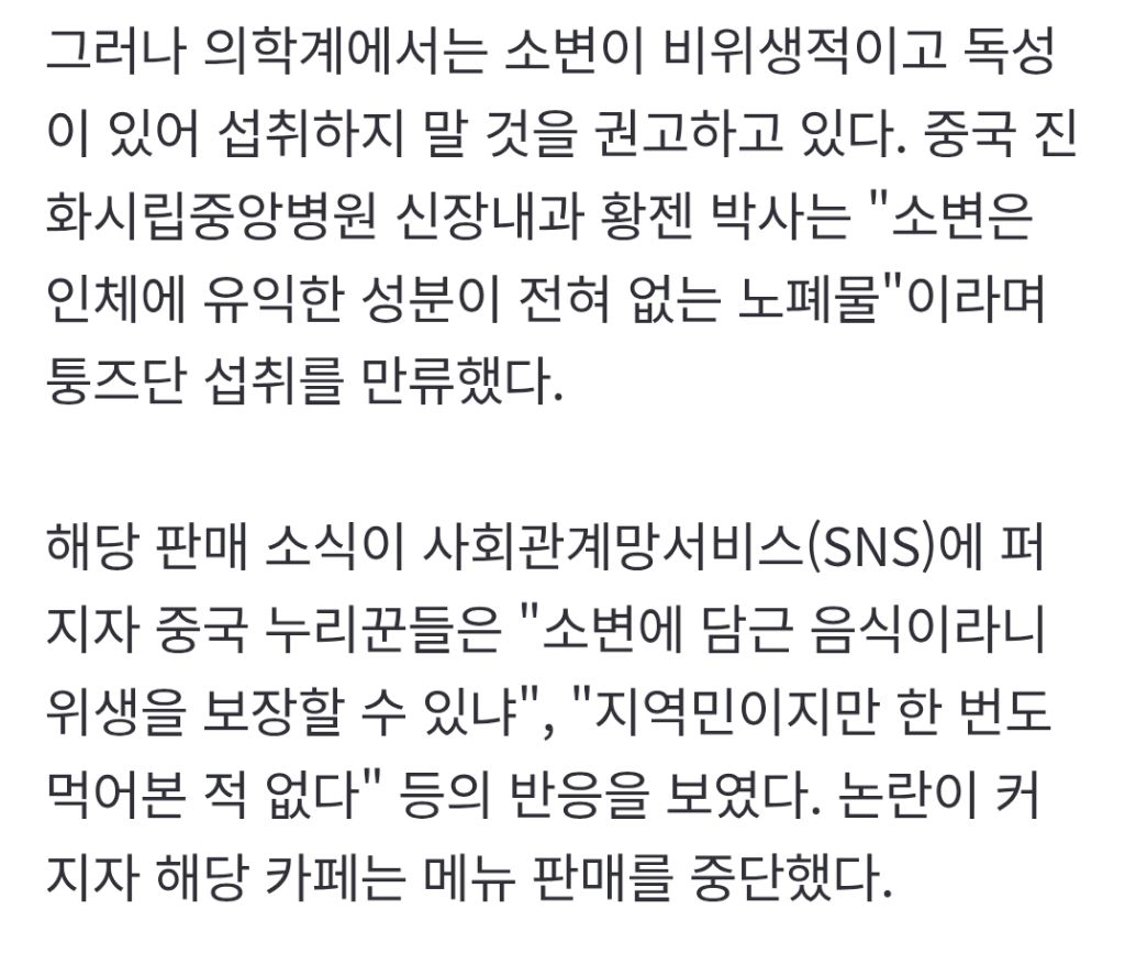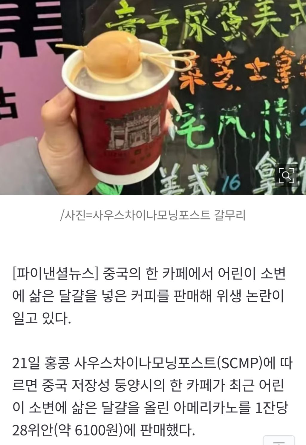 "소변에 삶은 달걀, 아메리카노 위에 올려 6100원".. 하루 100잔 팔린다는 이 메뉴, 위생논란 작성자통포|작성시간26.03.21|조회수16,644 목록 댓글 3 글자크기 작게가 글자크기 크게가 https://n.news.naver.com/article/comment/014/0005495083"소변에 삶은 달걀, 아메리카노 위에 올려 6100원".. 하루 100잔 팔린다는 이 메뉴, 위생논란중국의 한 카페에서 어린이 소변에 삶은 달걀을 넣은 커피를 판매해 위생 논란이 일고 있다. 21일 홍콩 사우스차이나모닝포스트(SCMP)에 따르면 중국 저장성 둥양시의 한 카페가 최근 어린이 소변n.news.naver.com 다음검색 현재 게시글 추가 기능 열기 북마크 공유하기 신고 센터로 신고 댓글 댓글 3 댓글쓰기 답글쓰기 댓글 리스트 작성자애보우 | 작성시간 26.03.21 하....왜먹냐 그걸... 작성자배털난아귀곰2 | 작성시간 26.03.21 어린이의 소변인지 아닌지가 중요한게 아닌데 아닐걸 알면서도 궁금하긴 함 작성자문도 | 작성시간 26.03.21 남의 전통인데 먹든말든 댓글 전체보기