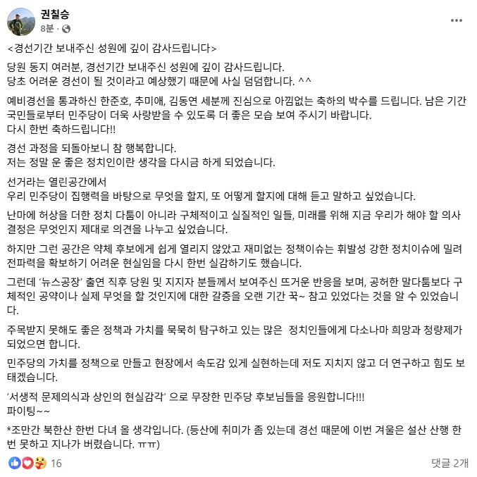 작성자맹구스 작성시간 26.03.22 권칠승 의원은 과거 성남시장 시절 이재명 시장과 느낌이 유사하더군요.
