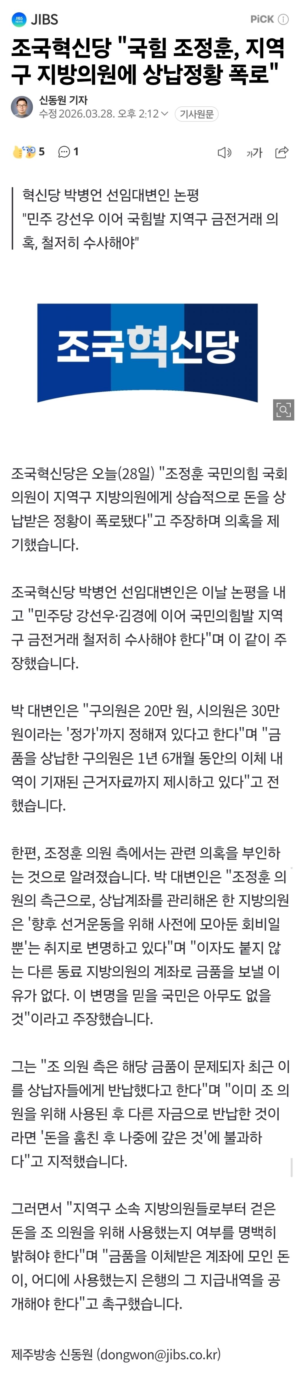 조국혁신당 "국힘 조정훈, 지역구 지방의원에 상납정황 폭로" 작성자불조심|작성시간26.03.28|조회수1,264 목록 댓글 15 글자크기 작게가 글자크기 크게가 탈탈털어보자 배신자놈 다음검색 현재 게시글 추가 기능 열기 북마크 공유하기 신고 센터로 신고 댓글 댓글 15 댓글쓰기 답글쓰기 댓글 리스트 작성자조자룡완전좋아 | 작성시간 26.03.28 new 강선우에 대해서는 풀발기 한 사람들의 풀발기를 다시한번 기원합니다 작성자나 쌍스런 사람 만들거야? | 작성시간 26.03.28 new 마포도 조정훈 뽑은것들은 B라고 봐야지 작성자Hugh Jackman | 작성시간 26.03.28 new 절대 그냥 넘어가지마라 작성자자무카 | 작성시간 26.03.28 new 잘 걸렸다 이놈 작성자송스키친 | 작성시간 26.03.28 new 그려 꼴뵈기 싫은새키 빨리빨리 조사해서 징역 보내자 댓글 전체보기