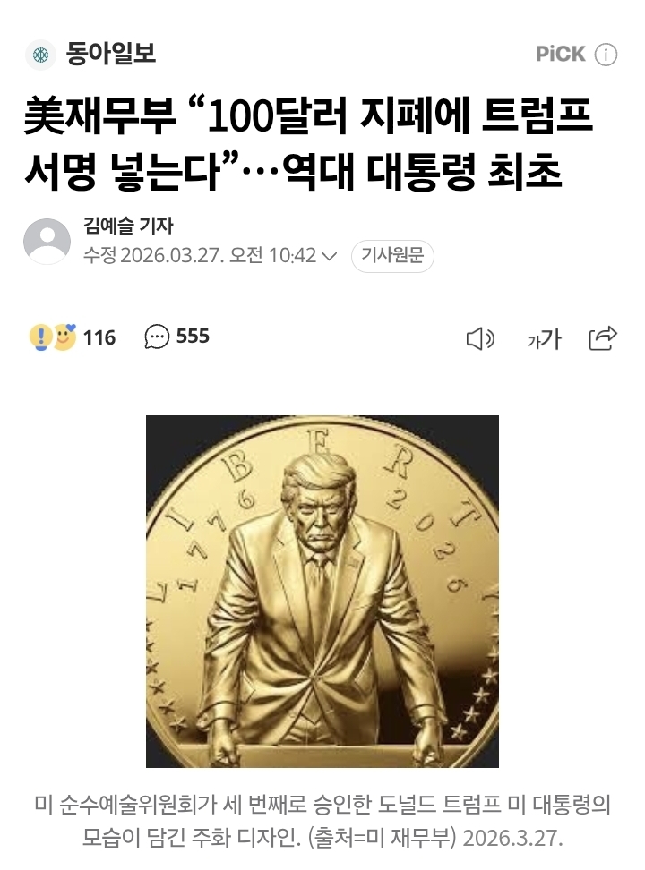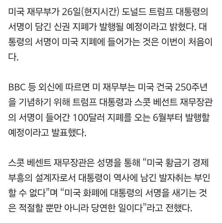 미국, 100달러 지폐에 트럼프 서명 각인 '미국 역사상 최초' 작성자레인메이커7|작성시간26.03.29|조회수2,335 목록 댓글 19 글자크기 작게가 글자크기 크게가 다음검색 현재 게시글 추가 기능 열기 북마크 공유하기 신고 센터로 신고 댓글 댓글 19 댓글쓰기 답글쓰기 댓글 리스트 작성자신길1동 | 작성시간 26.03.29 이게 된다고? 저 나라 희안하네 작성자어래산들개 | 작성시간 26.03.29 만화가 현실이 되네….예전 만화중에 망한 세상에서 폐허가된 가게에 들어가 버려진 지폐에도람프가 그려져있었던.. 작성자대끼리요 | 작성시간 26.03.29 곱게는 못.죽을듯 하다 저놈을 작성자슈니츠 | 작성시간 26.03.29 아이 근데 진짜 씨발 진심? 작성자메이저2 | 작성시간 26.03.29 미국은 탄핵제도 없냐? 댓글 전체보기