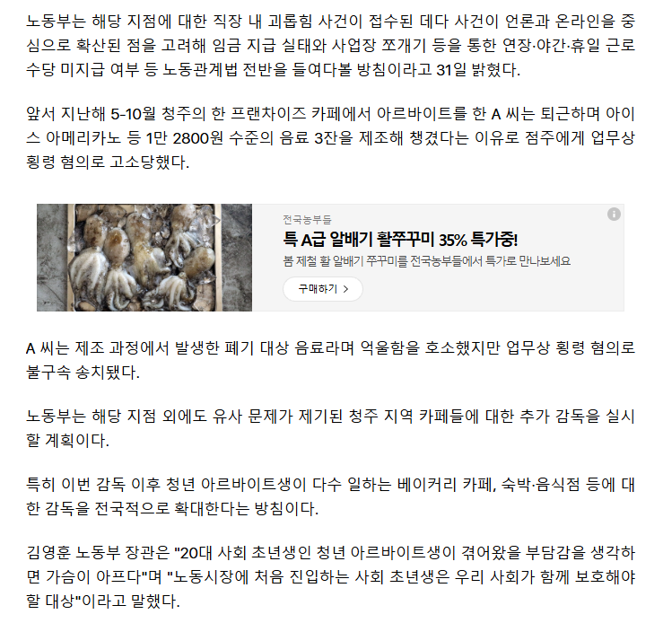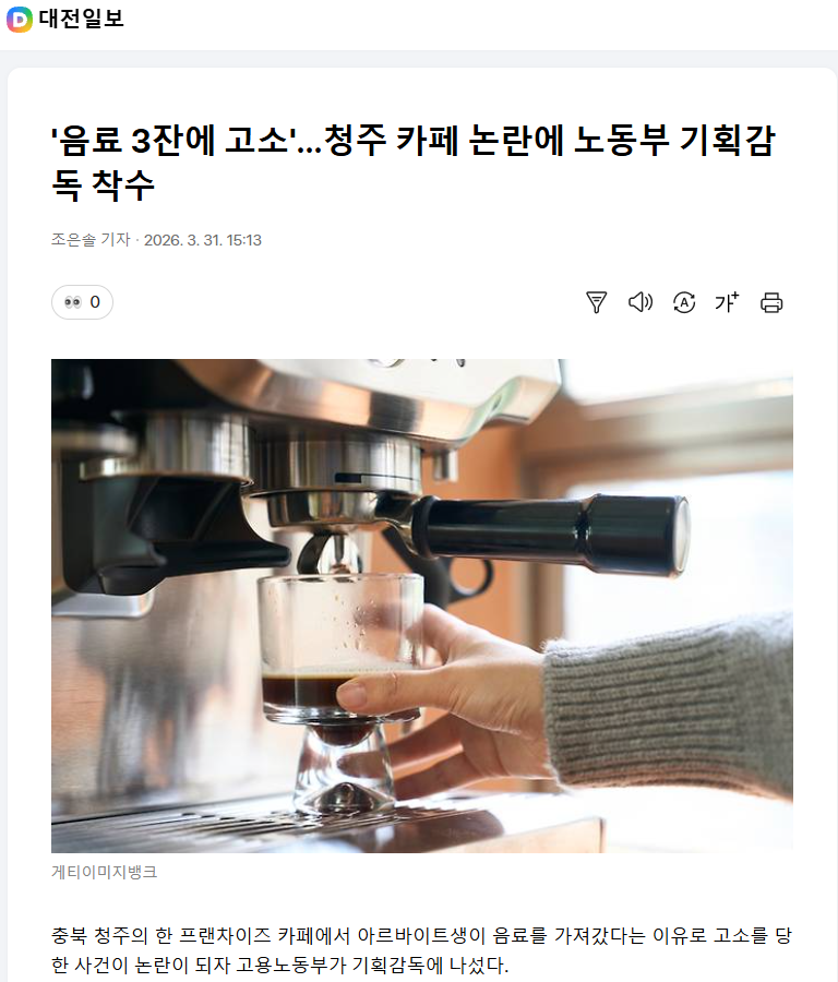 '음료 3잔에 고소'…청주 카페 논란에 노동부 기획감독 착수 작성자dlorean|작성시간26.03.31|조회수1,383 목록 댓글 5 글자크기 작게가 글자크기 크게가 https://youtu.be/qLteID2Bhm4?si=-mja0ugpujZU5RgT늦었지만 피해 회복하기를..... 다음검색 현재 게시글 추가 기능 열기 북마크 공유하기 신고 센터로 신고 댓글 댓글 5 댓글쓰기 답글쓰기 댓글 리스트 작성자김극혐 | 작성시간 26.03.31 판 커졌다 작성자yogabi1 | 작성시간 26.03.31 빽종원두나서겄네 ㅎ이거 양쪽얘기가 조사후봐야겄네유 작성자★AUDI A7★ | 작성시간 26.03.31 저런게 사람새끼냐. 작성자*불꽃남자* | 작성시간 26.03.31 장인수 기자 작성자어이정마담 | 작성시간 26.03.31 검찰이나 경찰이나 제대로된인간들이없네 댓글 전체보기