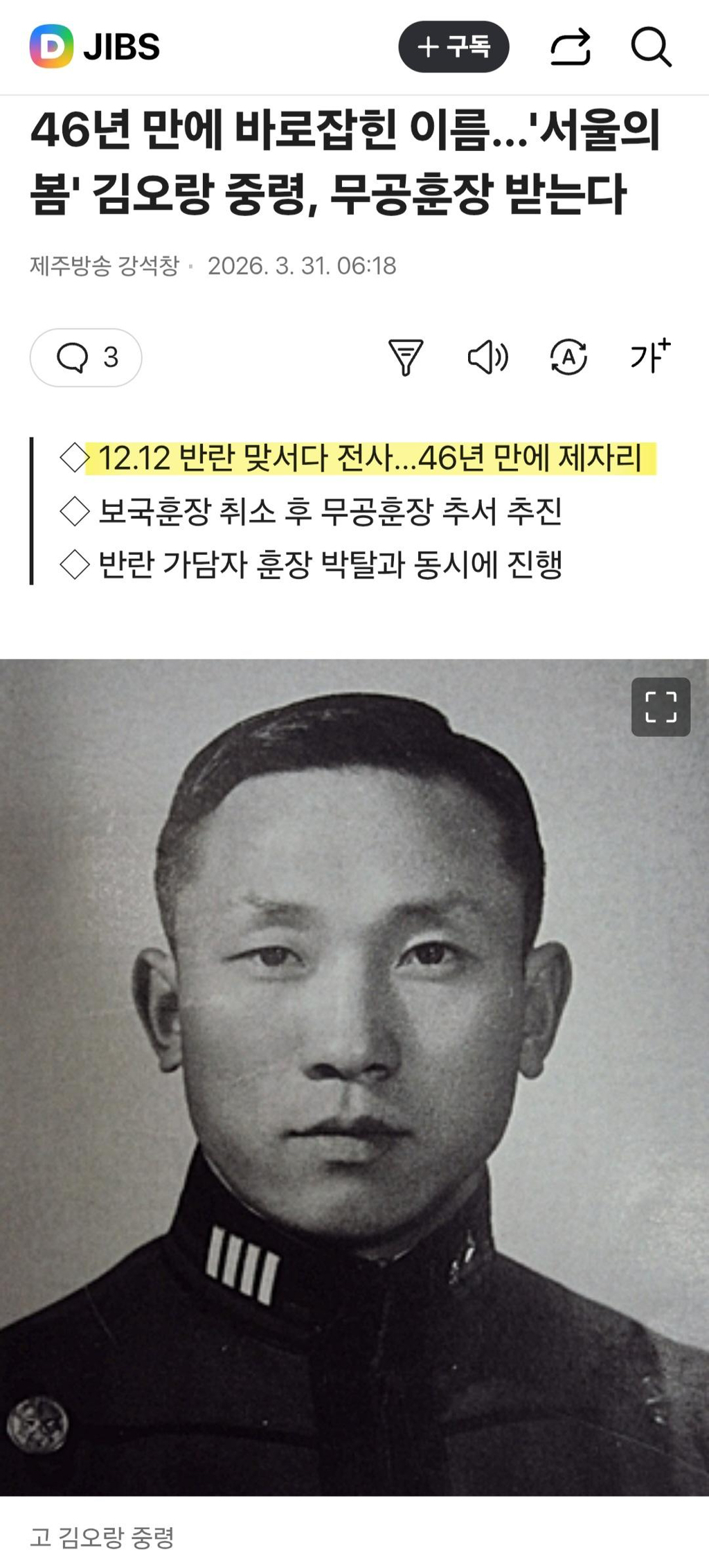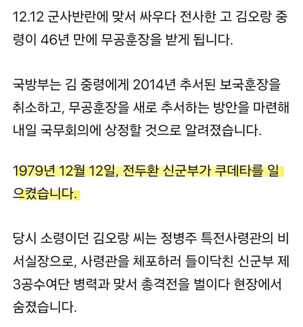 46년만에 바로 잡힌 그 이름..‘서울의 봄’ 김오랑 중령, 무공훈장 받는다 작성자Owada Akira|작성시간26.03.31|조회수1,214 목록 댓글 7 글자크기 작게가 글자크기 크게가 다음검색 현재 게시글 추가 기능 열기 북마크 공유하기 신고 센터로 신고 댓글 댓글 7 댓글쓰기 답글쓰기 댓글 리스트 작성자이 미련하고 답답한 고갱님아 | 작성시간 26.03.31 암튼 현정부 효능감 최고임.. 작성자플러스알파 | 작성시간 26.03.31 나이서~~~~ 작성자부활하라사쿠 | 작성시간 26.03.31 이래야지 비뚤어진 역사를 바로 잡아야지 매국노같은 역적들 다 파묘하고 널리 알리고 작성자웸반야마 | 작성시간 26.03.31 캬 인물보소 작성자황초롱이 | 작성시간 26.03.31 댓글 전체보기