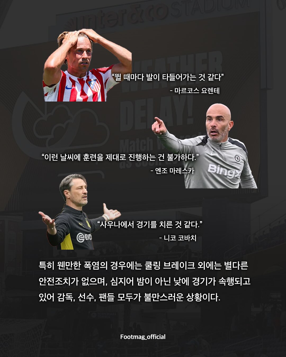 작성시간 25.06.29 날씨도 날씨지만 경기수가 너무 늘어나니 경기의 수준은 떨어지고 선수들의 수명은 짧아지는게 너무 안타까움.