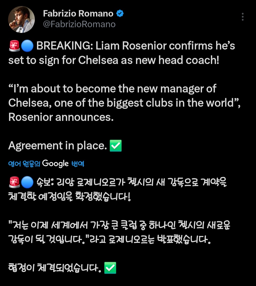 로제니어 to 첼시 here we go! 작성자DeadlyCoolStyle|작성시간26.01.06|조회수185 목록 댓글 1 글자크기 작게가 글자크기 크게가 다음검색 현재 게시글 추가 기능 열기 북마크 공유하기 신고 센터로 신고 댓글 댓글 1 댓글쓰기 답글쓰기 댓글 리스트 작성자애미야 | 작성시간 26.01.06 감독도 육성하는 팀이 되겠군 댓글 전체보기