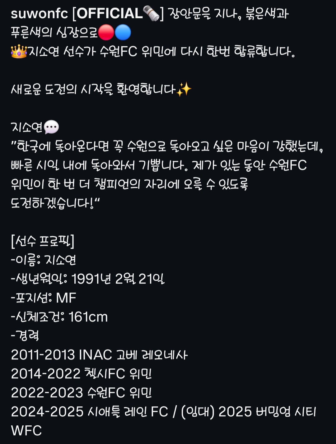 [오피셜] 수원FC 위민, 지소연 영입 작성자DeadlyCoolStyle|작성시간26.01.07|조회수752 목록 댓글 2 글자크기 작게가 글자크기 크게가 다음검색 현재 게시글 추가 기능 열기 북마크 공유하기 신고 센터로 신고 댓글 댓글 2 댓글쓰기 답글쓰기 댓글 리스트 작성자송강호검사 | 작성시간 26.01.07 지소연 👍👍👍 작성자김어준 | 작성시간 26.01.07 구장에 돈 좀 쓰자 묵을게 음따 ㅜㅠ 언제까지 홈플가냐 댓글 전체보기