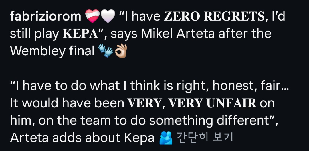 아르테타:: 경기전으로 다시 돌아가도 케파 작성자DeadlyCoolStyle|작성시간26.03.23|조회수269 목록 댓글 1 글자크기 작게가 글자크기 크게가 후회는 없다 다시 돌아가도 케파를 쓸 것이다아르테타는 이어서나는 정직하고 공정하게 내가 옳다고 생각하는 선택을 해야 한다다른 선택을 했다면 케파에게도, 팀에게도 매우 불공정했을 것 이라고 덧붙였다 다음검색 현재 게시글 추가 기능 열기 북마크 공유하기 신고 센터로 신고 댓글 댓글 1 댓글쓰기 답글쓰기 댓글 리스트 작성자SugarRa y | 작성시간 26.03.23 준우승에 만족하는구나 댓글 전체보기
