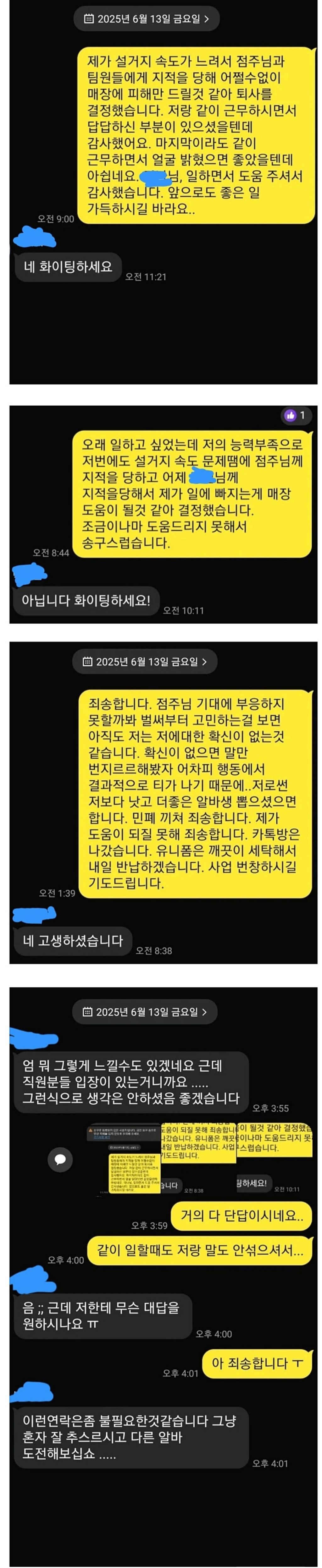 [스크랩] mz의 퇴사 문자 작성자불멸의 나날|작성시간25.09.05|조회수136 목록 댓글 4 글자크기 작게가 글자크기 크게가 다음검색 스크랩 원문 : 樂soccer 현재 게시글 추가 기능 열기 북마크 공유하기 신고 센터로 신고 댓글 댓글 4 댓글쓰기 답글쓰기 댓글 리스트 작성자ooooo간다 | 작성시간 25.09.05 ㅋㅋ 뭐지 싶네요 작성자레알깜2 | 작성시간 25.09.05 세상엔 특이한 사람 많다 ㅎ 작성자supervisor | 작성시간 25.09.05 mz가 저런 장문을 남긴다......잉... 어색하다 ㅎㅎ 작성자조배우 | 작성시간 25.09.06 에고... 설거지 속도가 문제가 아닐꺼야... 댓글 전체보기