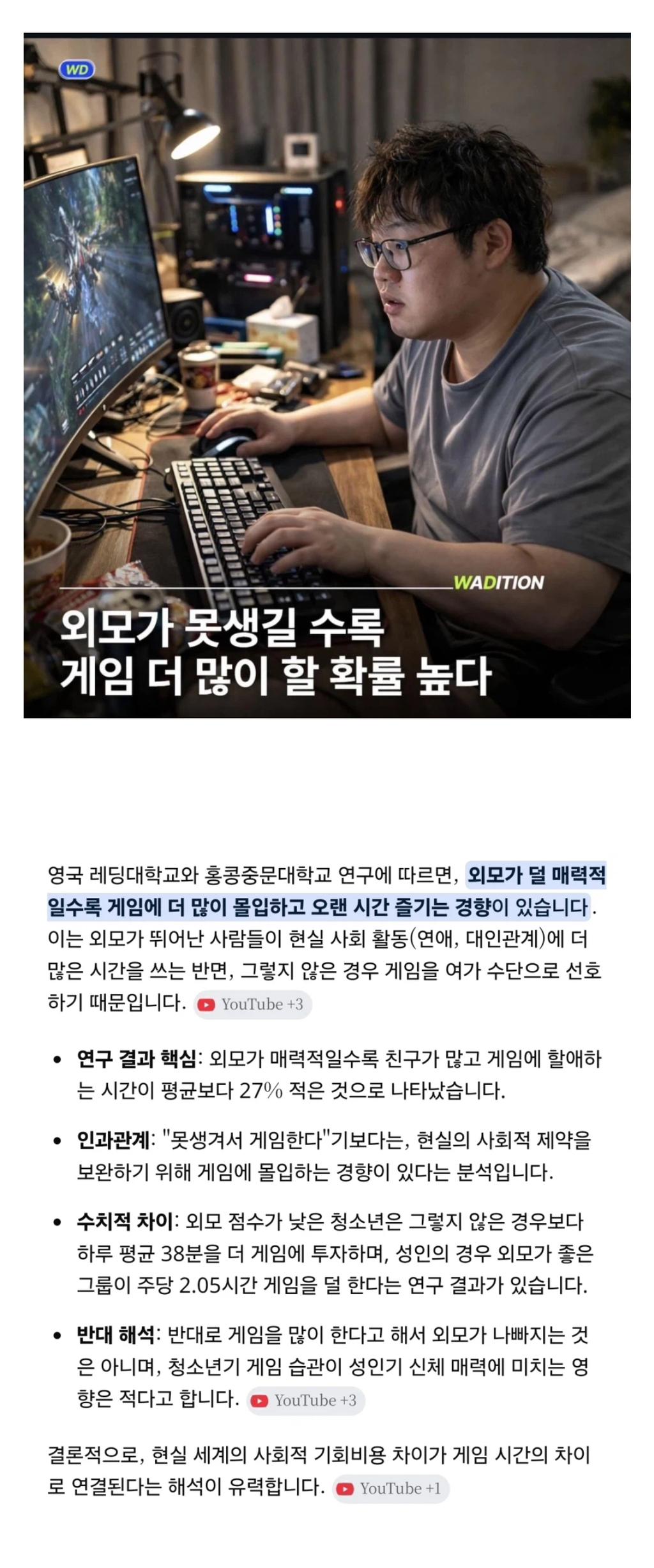 외모가 못생길수록 게임 더 많이 한다 작성자chris2log|작성시간1시간 39분 전|조회수50 목록 댓글 2 글자크기 작게가 글자크기 크게가 제가 게임 덕후가 된 이유가 이거였어요. ㅠㅠ 다음검색 현재 게시글 추가 기능 열기 북마크 공유하기 신고 센터로 신고 댓글 댓글 2 댓글쓰기 답글쓰기 댓글 리스트 작성자질색팔색 | 작성시간 1시간 19분 전 new 겜하고 싶다... 작성자언젠간트진다 | 작성시간 33분 전 new 전 못생겼는데게임을 잘… 댓글 전체보기