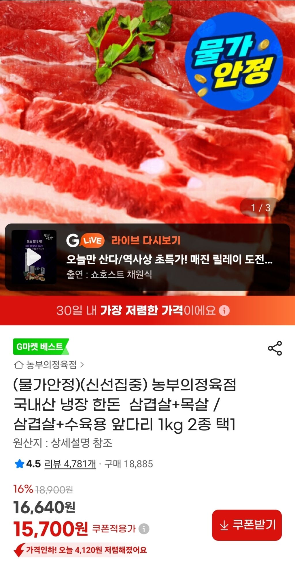 [식품/건강][G마켓]농부의정육점 국내산 냉장 한돈 삼겹살+목살 / 삼겹살+수육용 앞다리 1kg 2종 택1 -15,700원 작성자부모님|작성시간26.04.09|조회수306 목록 댓글 2 글자크기 작게가 글자크기 크게가 https://link.gmarket.co.kr/cxEtTonGKB가격이 착하네요 다음검색 현재 게시글 추가 기능 열기 북마크 공유하기 신고 센터로 신고 댓글 댓글 2 댓글쓰기 답글쓰기 댓글 리스트 작성자존경^^ | 작성시간 26.04.09 14560원으로 결제했어요감사용 작성자ThreePPa | 작성시간 26.04.09 여기 고기 맛납니다 추천~! 댓글 전체보기