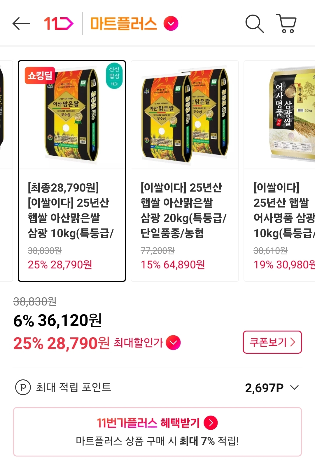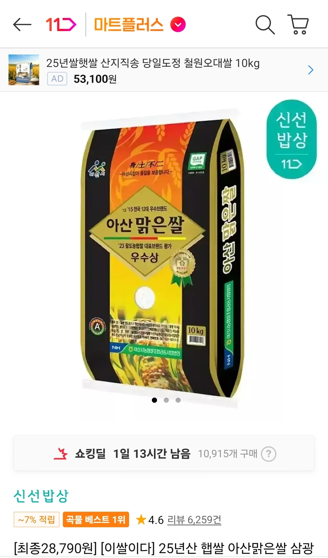 [식품/건강][11번가] 어플전용 - 25년산 햅쌀 아산맑은쌀 삼광 10kg - 28,790원 작성자일소일맥4|작성시간26.04.10|조회수277 목록 댓글 4 글자크기 작게가 글자크기 크게가 링크 : http://www.11st.co.kr/products/3085984766/share[11번가] [최종28,790원] [이쌀이다] 25년산 햅쌀 아산맑은쌀 삼광 10kg(특등급/단일품종/농협 GAP인증)카테고리: 백미, 가격 : 36,120원www.11st.co.kr 어플에서 구입해야 28,790원 입니다. 다음검색 현재 게시글 추가 기능 열기 북마크 공유하기 신고 센터로 신고 댓글 댓글 4 댓글쓰기 답글쓰기 댓글 리스트 작성자100개가진알콜쟁이 | 작성시간 26.04.10 어제 고시히카리 4.5에 샀는데 작성자피빛하늘 | 작성시간 26.04.10 쌀값도 많이 올랐군요 싸진게 3만원정도라니 ㅠ 작성자윤계상 | 작성시간 26.04.10 이 쌀 맛있는데 쟁여놔야겠네요 작성자광빨에기절 | 작성시간 26.04.10 며칠전 구입한거 어제 왔는데 추가 구매 합니다.전 삼광미만 먹거든요 댓글 전체보기