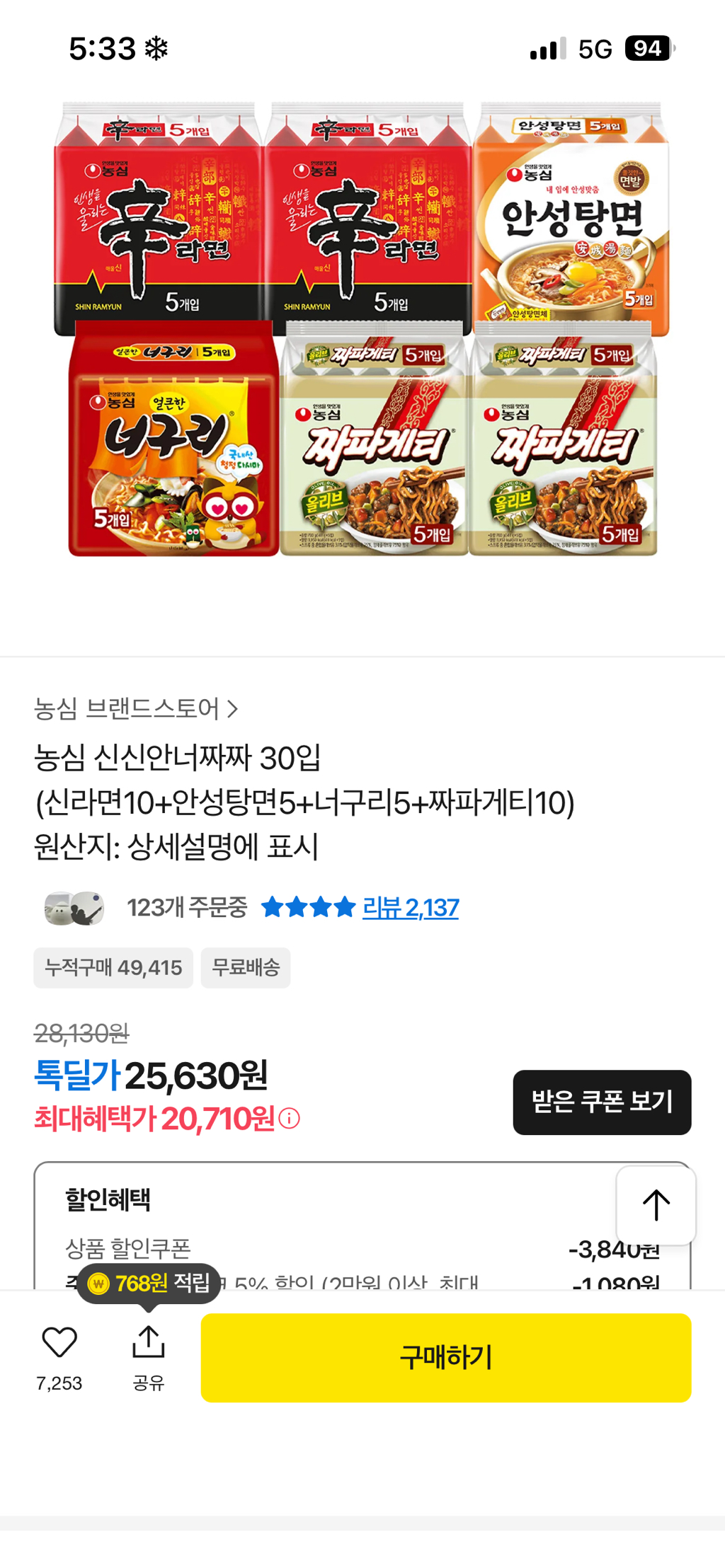 [식품/건강] [카카오톡딜] 상품명: 농심 신신안너짜짜 30입 (신라면10+안성탕면5+너구리5+짜파게티10) 20,710원 작성자Keanu|작성시간26.04.10|조회수343 목록 댓글 2 글자크기 작게가 글자크기 크게가 https://store.kakao.com/nongshim/products/466459252?ref=SHARE 다음검색 현재 게시글 추가 기능 열기 북마크 공유하기 신고 센터로 신고 댓글 댓글 2 댓글쓰기 답글쓰기 댓글 리스트 작성자100개가진알콜쟁이 | 작성시간 26.04.10 싼건가요? 답댓글 작성자Laurence | 작성시간 26.04.10 보통 한봉에 40~45정도 한다고 보면 댓글 전체보기