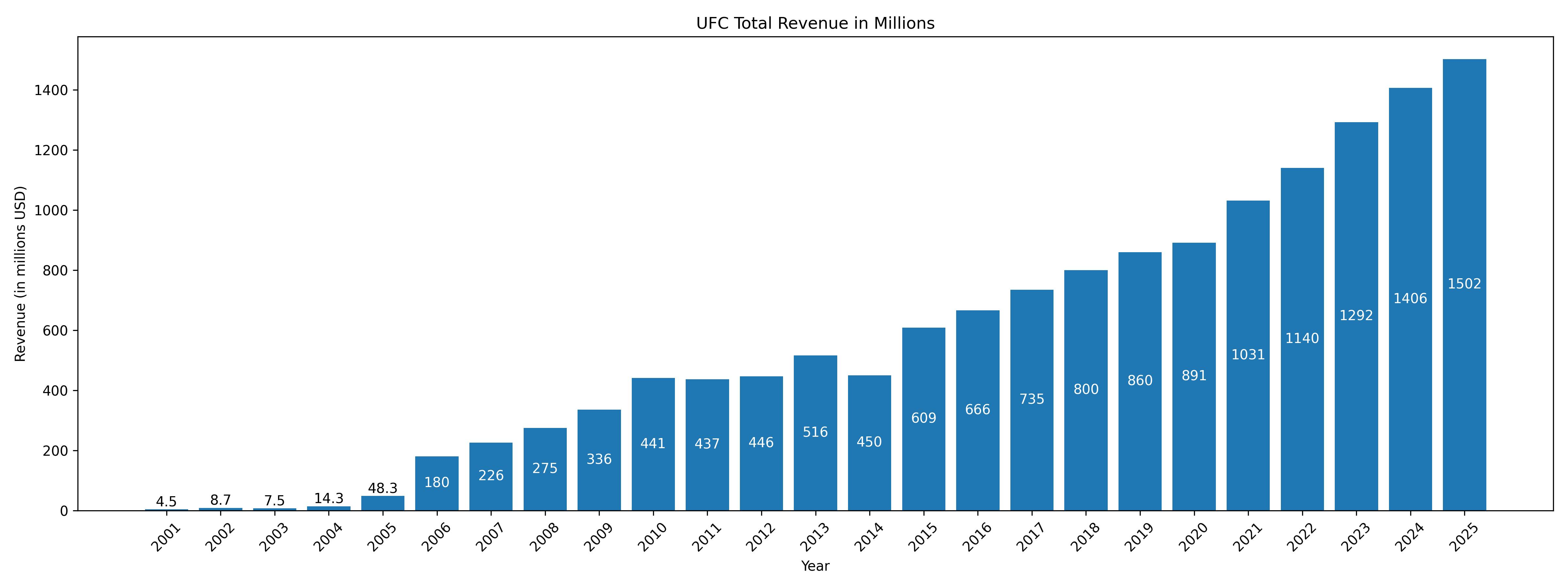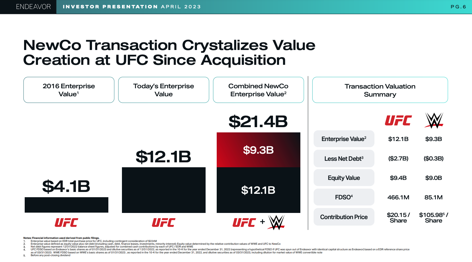 * 2023년 9월, WWE와의 합병, TKO 그룹 홀딩스 상장 당시 121억 달러(약 17조 원)로 평가