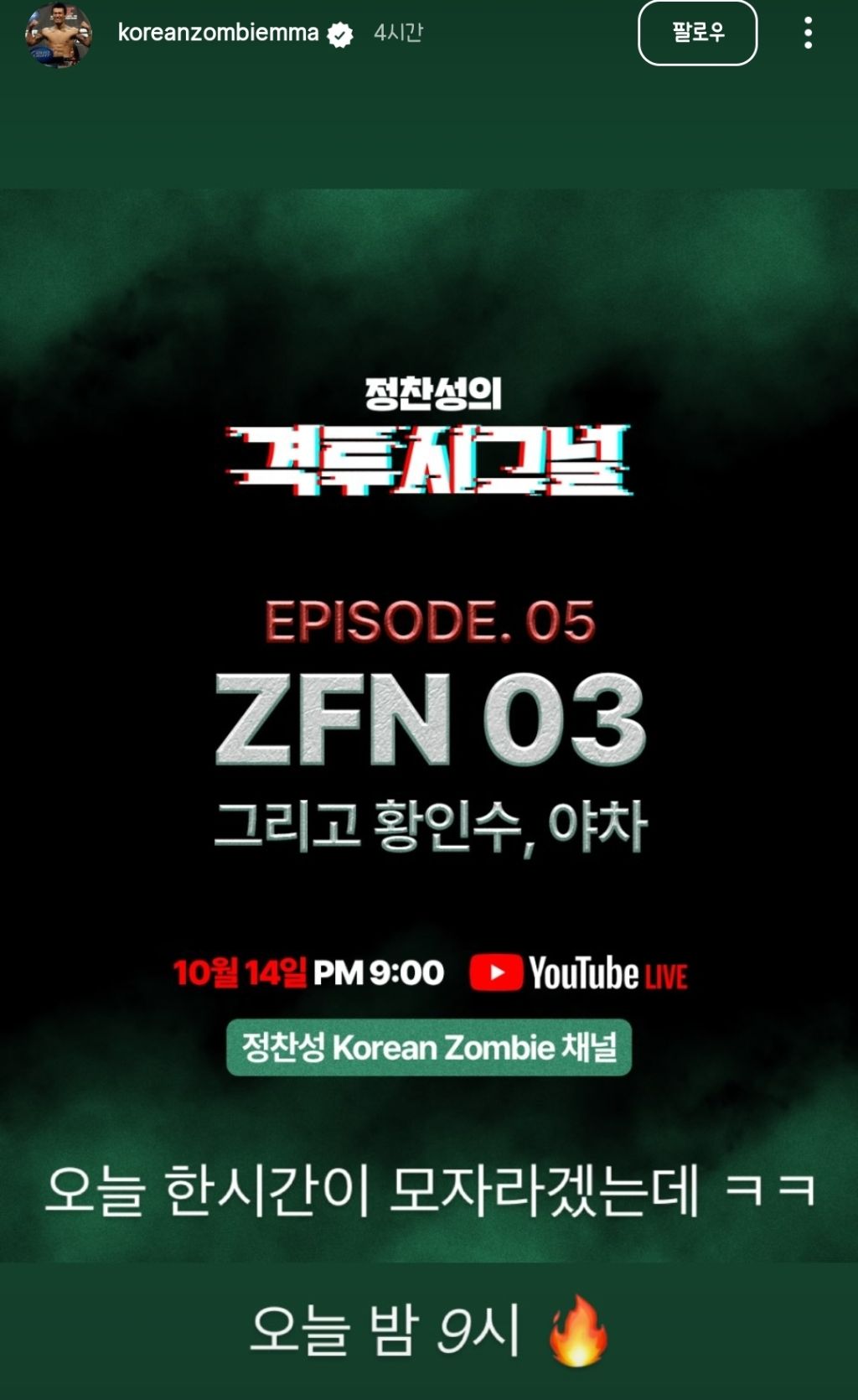 정찬성 유튜브 채널 9시 라이브