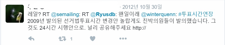 당시 민주통합당은 투표 시간 연장을 주장했고 새누리당은 이에 반대하는 상황이었는데 류준열이 투표시간 연장을 반대하는 새누리당을 까는 트윗을 올림