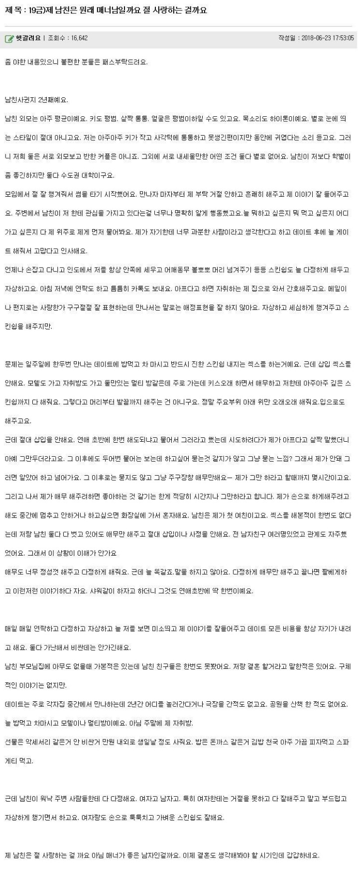 작성시간 18.07.24 하아 경험 부족일수있음.. 제가 딱 20살되었을때 아는 여자가 술먹자고해서 먹다가 졸리다고 모텔가자고 했는데 여자가.. 갔는데 막 애무하고 다하고했는데. 넣지 못했음.. 왠지 넣는게 무서웠음.... 그이후에도 대학생때 . 20살이후엔 여자친구 몇명 사귀면서 섹스는 했었음.