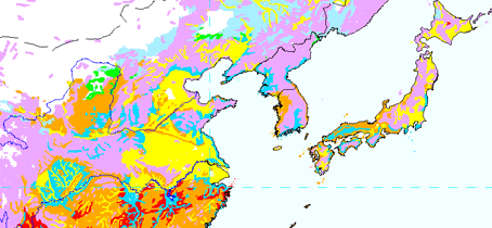 한반도에 유독 분홍색이 많이보이시는걸 알수있습니다. 분홍색은 대체로 산지라고 보시면 됩니다.
