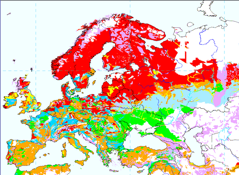 북유럽 상당 지역 등을 보면 분홍색이 유독 많은걸 알수있는데, 이것들은 산지 내지 산맥들이라고