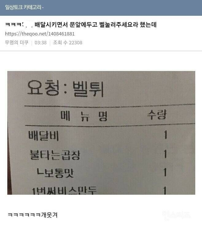 이종격투기 배달 시키면서 '문 앞에 두고 벨 눌러 주세요' 라고 했는데 작성시간23.12.09|조회수18,783 목록 댓글 3 글자크기 작게가 글자크기 크게가 다음검색 현재 게시글 추가 기능 열기 북마크 공유하기 신고 센터로 신고 댓글 3 댓글 리스트 작성시간 23.12.09 ㅋㅋ 작성시간 23.12.09 ㅋㅋㅋㅋㅋ 작성시간 23.12.09 이미지 확대 카페 방문해 더 많은 댓글 만나기!