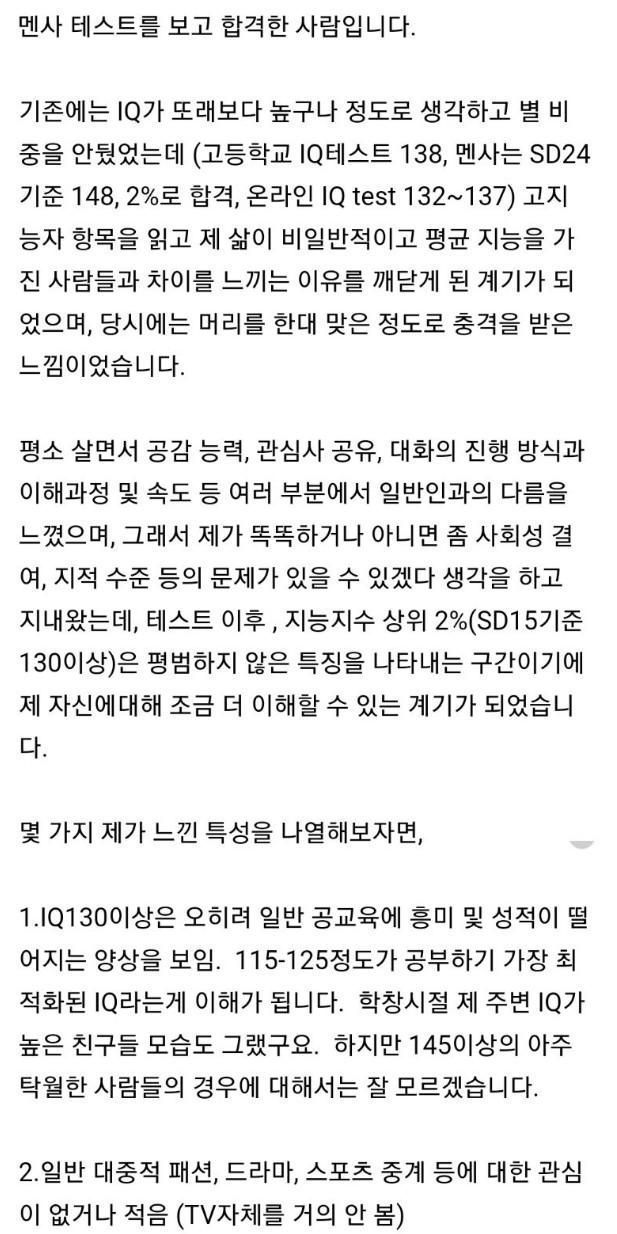 작성자리버워크 작성시간 24.01.05 고등학교 1학년 때 750명 전교생 중에서 아이큐가 젤 높게 나왔죠. 그래서 3년 내내 선생님들로 부터 핀잔을 들었습니다. 고로 아이큐와 학교 성적은 반비례 합니다!ㅠ