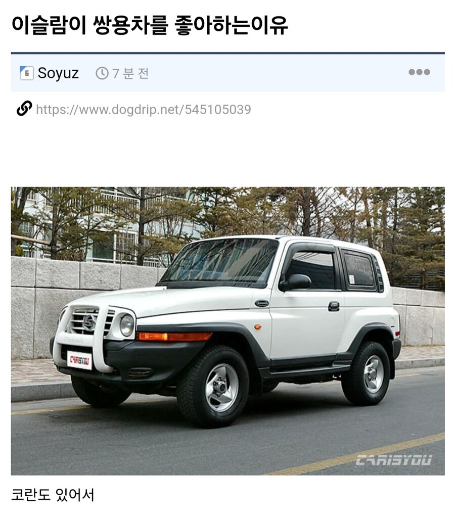 이슬람인들이 쌍용차를 선호하는 이유. 작성자올바른정신|작성시간24.03.15|조회수14,961 목록 댓글 12 글자크기 작게가 글자크기 크게가 다음검색 현재 게시글 추가 기능 열기 북마크 공유하기 신고 센터로 신고 댓글 댓글 12 댓글쓰기 답글쓰기 댓글 리스트 작성자스산한발자국 | 작성시간 24.03.15 ㅋㅋㅋ 작성자아가타 슌세이 | 작성시간 24.03.15 와 예상못했네 ㅎㅎㅎㅎㅎ 작성자낙센 | 작성시간 24.03.15 ㅋㅋㅋㅋㅋ 작성자PC방사장 | 작성시간 24.03.16 무슨뜻이지.. 답댓글 작성자벌써퇴근하냐?내일지각마라 | 작성시간 24.03.16 이슬람 경전 = 코란 댓글 전체보기