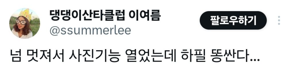 넘 멋져서 사진기능 열었는데 하필 똥싼다... 작성자Sinjo협솔|작성시간24.06.11|조회수35,824 목록 댓글 6 글자크기 작게가 글자크기 크게가 다음검색 현재 게시글 추가 기능 열기 북마크 공유하기 신고 센터로 신고 댓글 댓글 6 댓글쓰기 답글쓰기 댓글 리스트 작성자뽀로롱타임 | 작성시간 24.06.11 holy shit ㅋㅋㅋㅋ 작성자이ju | 작성시간 24.06.11 요가하는거라해줘.. 작성자간다르바야 | 작성시간 24.06.11 우리 강아지도 이래서 식겁했네요 ㅋ 이미지 확대 작성자너꺼무떡거럴 | 작성시간 24.06.11 ㅋㅋㅋㅋ holy 작성자쥬스아빠 | 작성시간 24.06.11 똥쟁이 표정 ㅎㅎㅎ 귀엽네... 댓글 전체보기