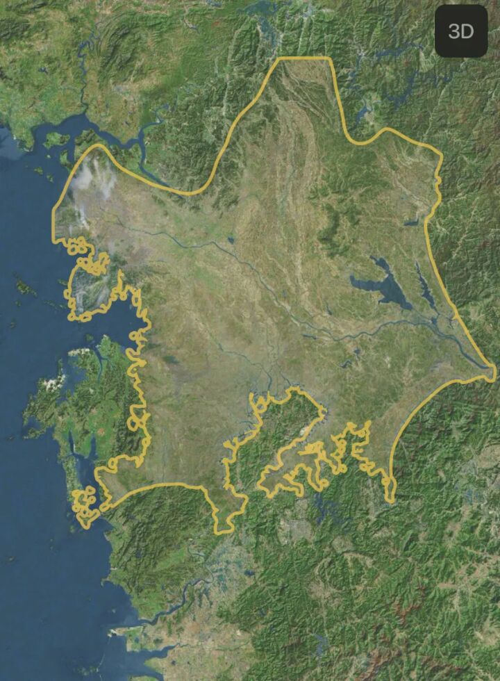 면적 17,000km² 동서길이 130km 남북길이 100km정도.