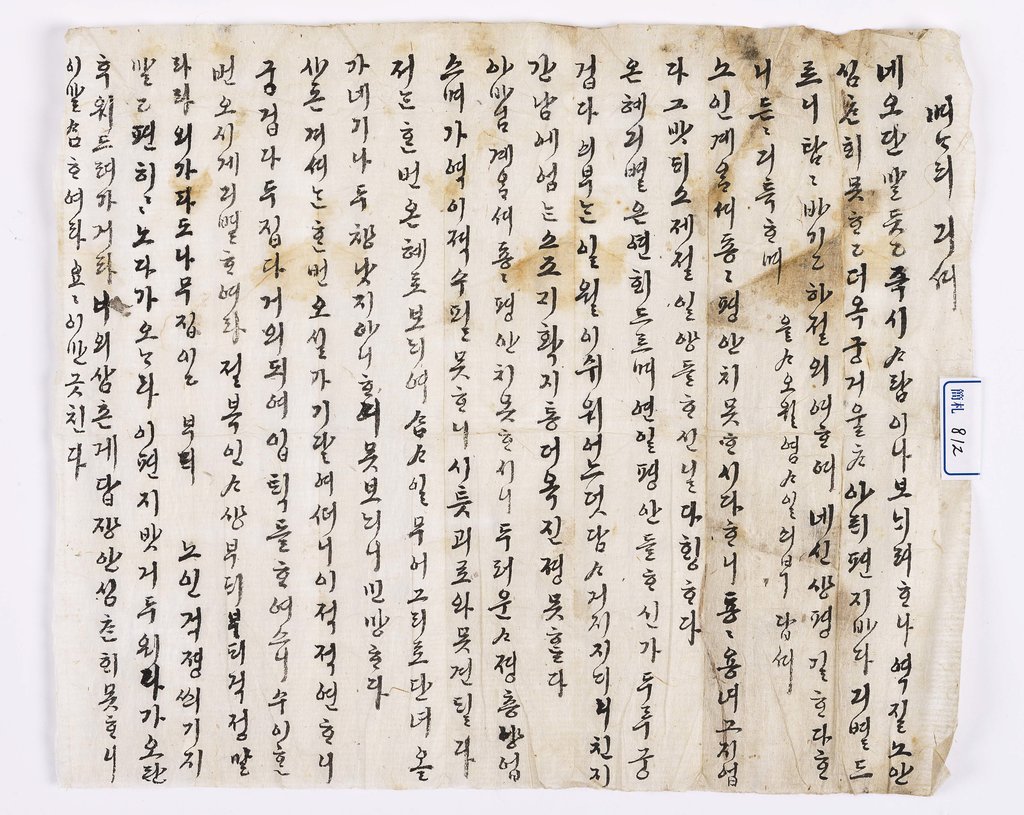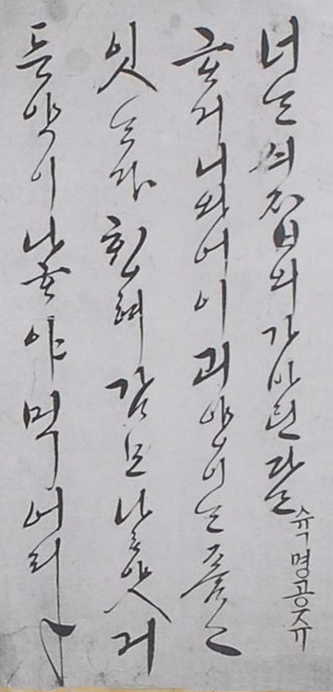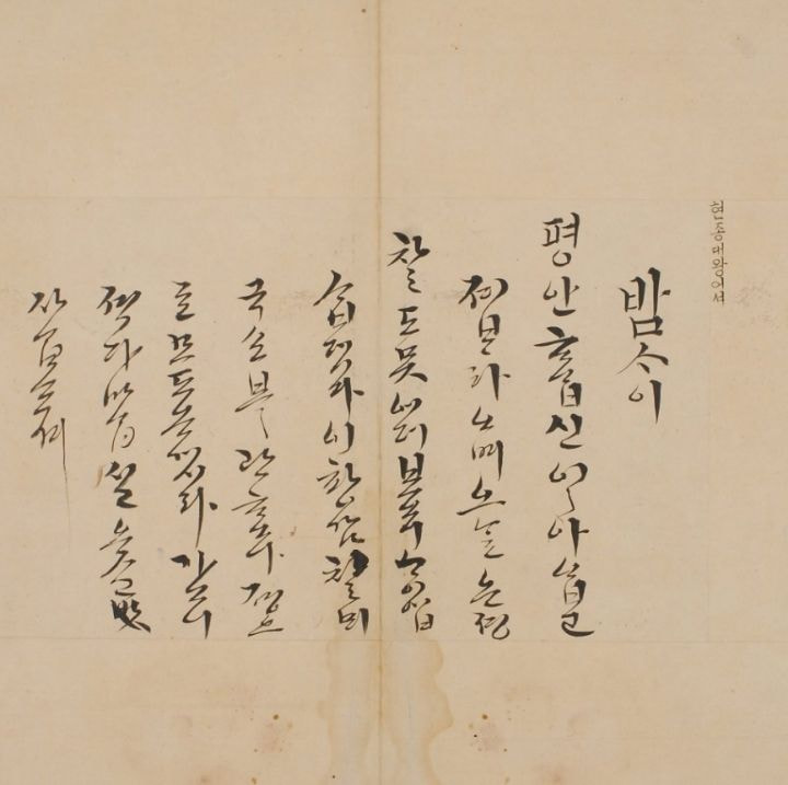 "밤사이 평안하옵신 일 없길 바라오며 오늘은 정겨운 편지도 못 얻어보니 그립기 그지 없었습니다.