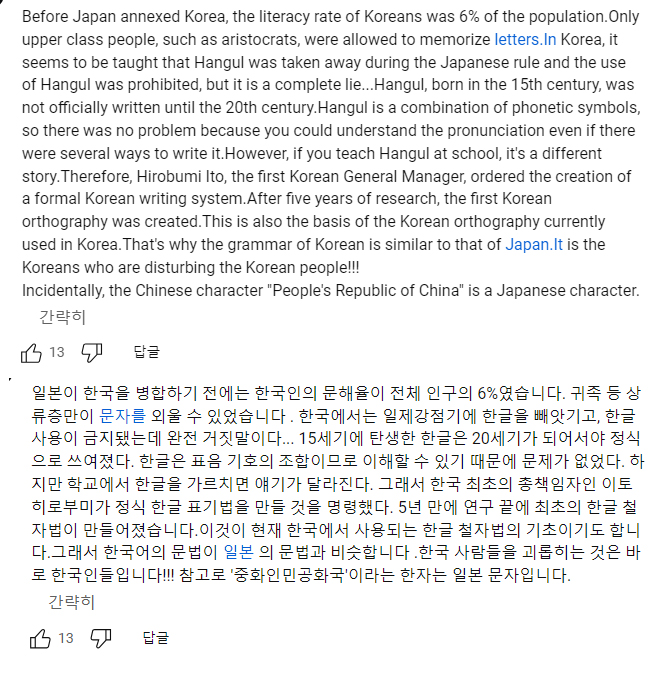 유튜브에서 흔히 볼수 있는 한글공정 하는 일본인들 댓글