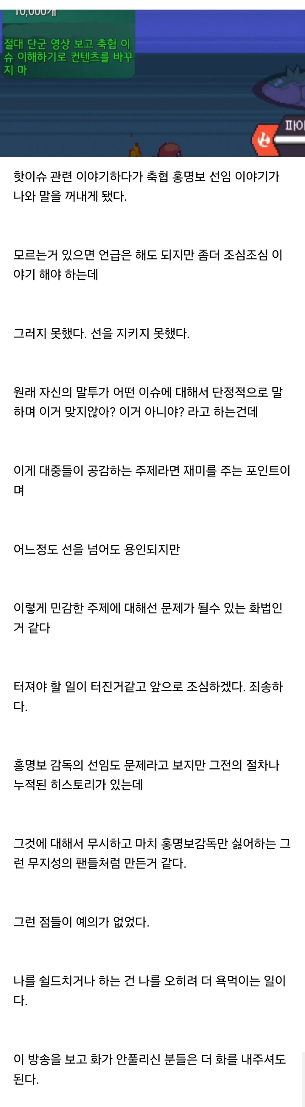침착맨 홍명보 발언 사건 반응 작성자적셔.|작성시간24.07.15|조회수8,419 목록 댓글 49 글자크기 작게가 글자크기 크게가 다음검색 현재 게시글 추가 기능 열기 북마크 공유하기 신고 센터로 신고 댓글 댓글 49 댓글쓰기 답글쓰기 댓글 리스트 작성자니놈이감히 | 작성시간 24.07.16 본적도 없지만왜 구독자가 많은건지 작성자돌돌잉 | 작성시간 24.07.16 영향력이 있는만큼 조심해야함 일반인이랑 다름 삭제된 댓글입니다. 답댓글 작성자CLUB HACIENDA | 작성시간 24.07.16 22 작성자단언컨대 | 작성시간 24.07.16 가만히 있으면 중간이라도 가지 에휴 댓글 전체보기