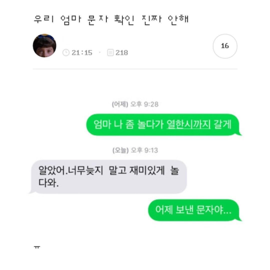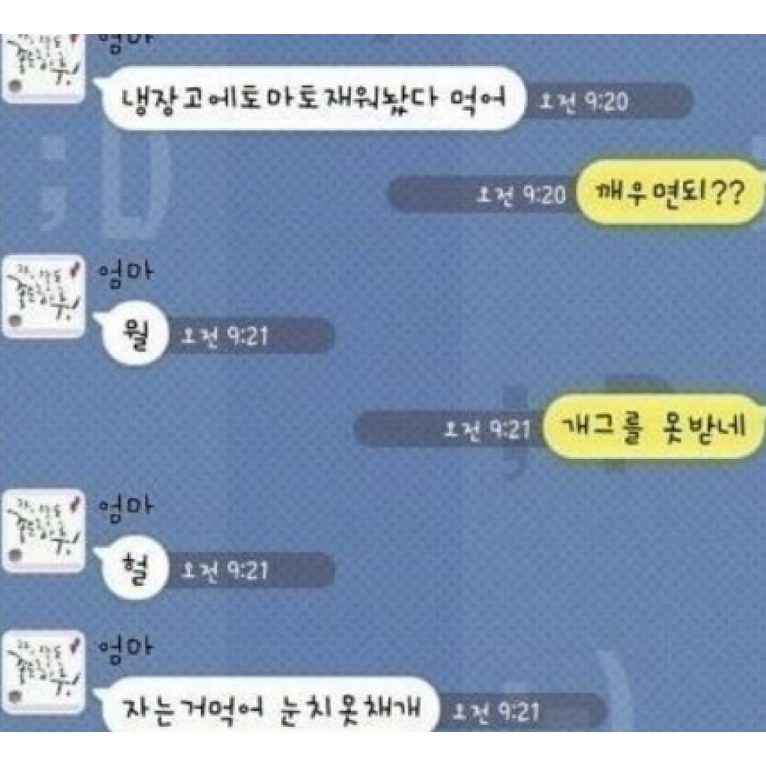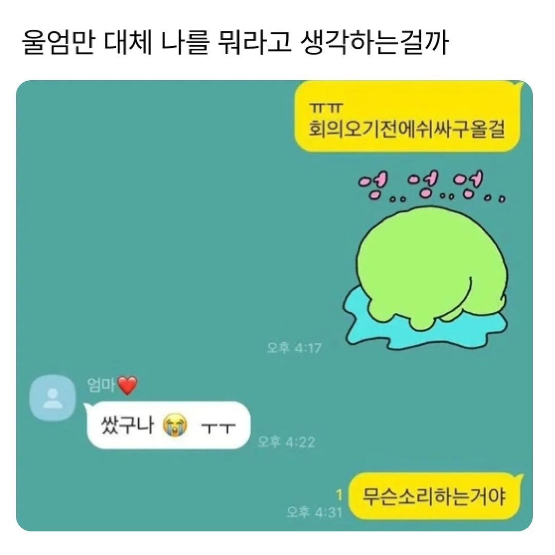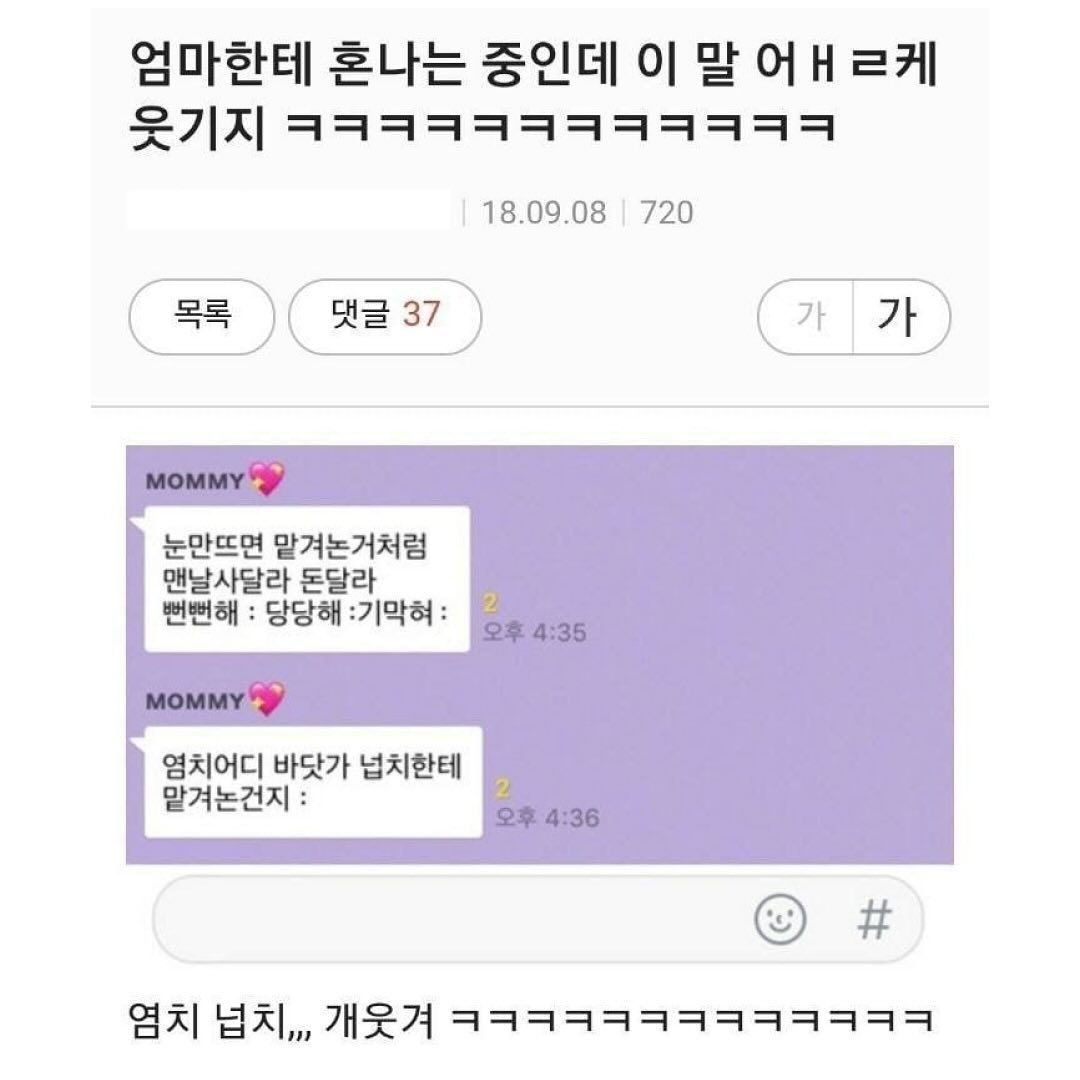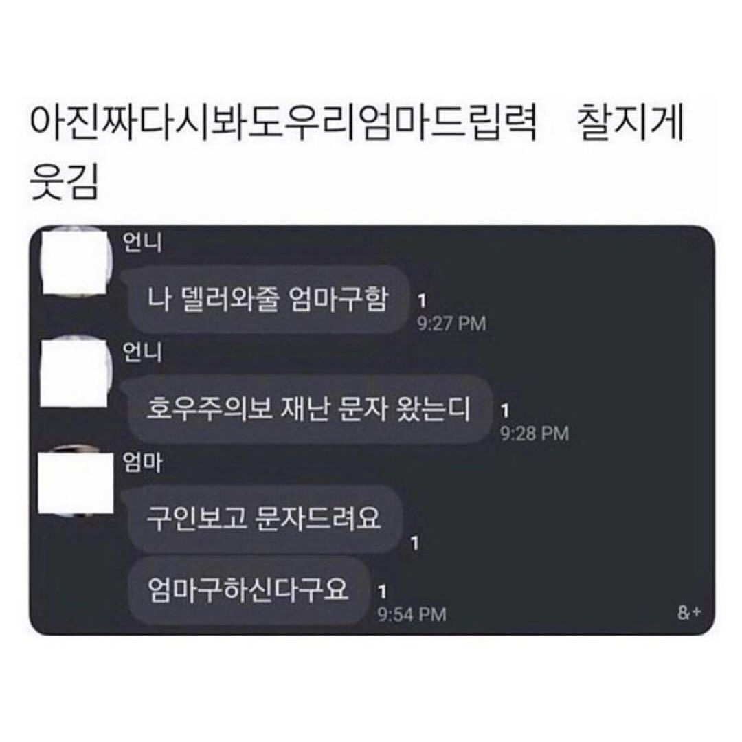 우리가 치는 드립은 이분들에 비하면 아무것도 아니다 ㅋㅋ 작성자정신병환자2|작성시간24.09.04|조회수6,769 목록 댓글 10 글자크기 작게가 글자크기 크게가 엄마한테 깝치지 말자 ㅋ 다음검색 현재 게시글 추가 기능 열기 북마크 공유하기 신고 센터로 신고 댓글 댓글 10 댓글쓰기 답글쓰기 댓글 리스트 작성자참치로태어날걸 | 작성시간 24.09.04 나랑 우리 딸 톡도 딱 저 수준인데..아들은 안 받아줌.개슬퍼. 작성자바쁜 벌꿀은 슬퍼할 시간도 없다 | 작성시간 24.09.04 ㅗ는 뭐여 ㅋㅋ 작성자대한늬우스 | 작성시간 24.09.04 엄마의 드립력 작성자프라블람 썰브드 | 작성시간 24.09.04 쌌구나ㅋㅋ 작성자커리야지금메시니? | 작성시간 24.09.04 엄마한테 잘합시다!!! 댓글 전체보기