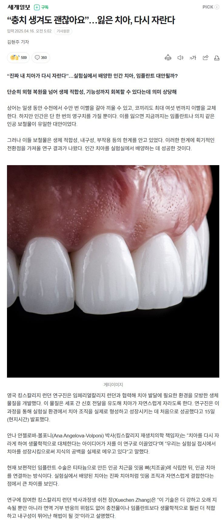 킹스칼리지 런던의 보철학 임상 강사 시어셔 오툴(Saoirse O‘Toole) 박사는 “치아를 재생하는 이 새로운 기술은 매우 흥미롭고, 치의료계의 판도를 바꿀 수 있다”며 “내 평생 진료에 적용되긴 어려울 수도 있지만, 내 자식의 자식 세대에는 충분히 가능할 것”이라고 전망했다.