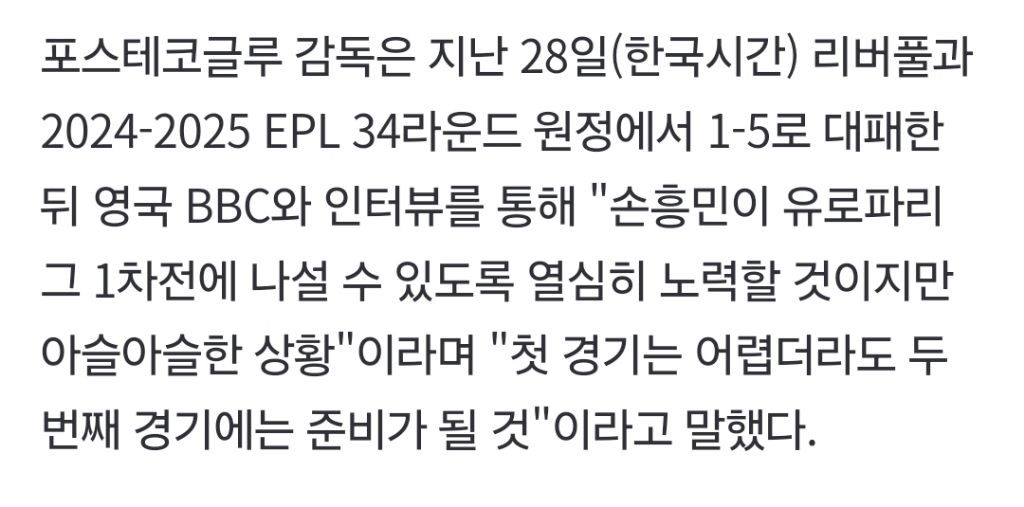 이종격투기 유로파 4강 2차전에 손흥민 출전 여부 인터뷰 작성시간25.05.02|조회수9,216 목록 댓글 4 글자크기 작게가 글자크기 크게가 다음검색 현재 게시글 추가 기능 열기 북마크 공유하기 신고 센터로 신고 댓글 4 댓글 리스트 작성시간 25.05.02 안나와도된다이탐에 닭트넘 팀에서는 좀 나가자 작성시간 25.05.02 2차전 쉬고결승전에 몸 만들어서 우승컵 하나 들고이적! 작성시간 25.05.02 저팀한테 지면 유로파가 아니라프리미어리그 퇴출이맞지 작성시간 25.05.02 결승가면 나오자 카페 방문해 더 많은 댓글 만나기!