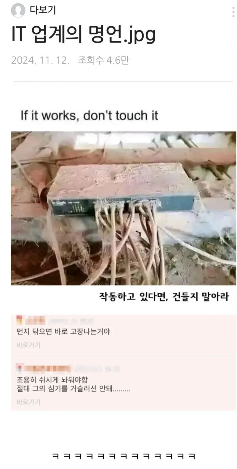 작성시간 25.05.04 IT뿐만이 아님 공장에서 썪어 문들어진 기계가 잘 돌아간다면 그대로 나두면 됨 괜히 정기pm한다고 건들면 그 기계의 운명은 그날까지임